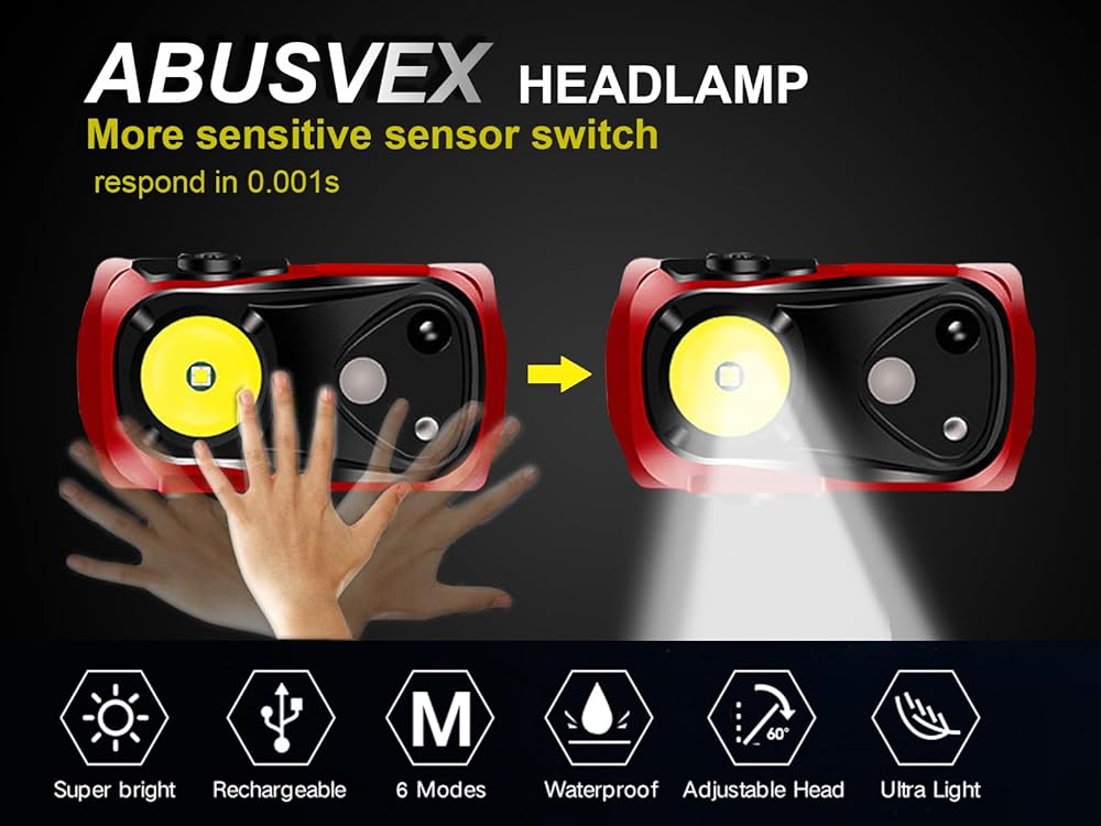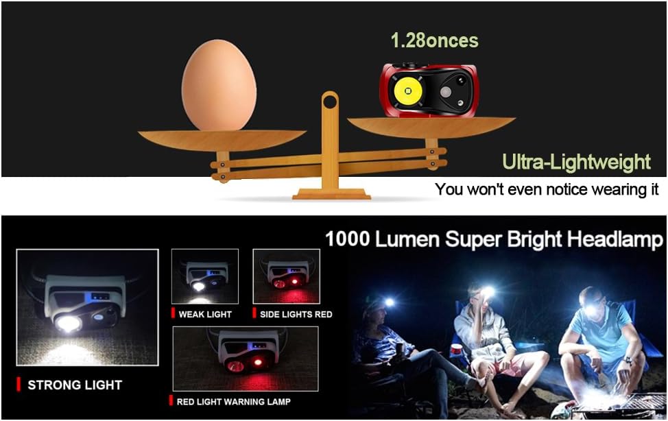 مصباح أمامي قابل لإعادة الشحن، عبوة من قطعتين، مصباح أمامي LED ساطع للغاية 1000 لومن مع ضوء أحمر أبيض، مصباح رأس بمستشعر حركة مقاوم للماء للغاية، 6 أوضاع للجري في الهواء الطلق، والإصلاح، وصيد الأسماك، والمشي للكلاب