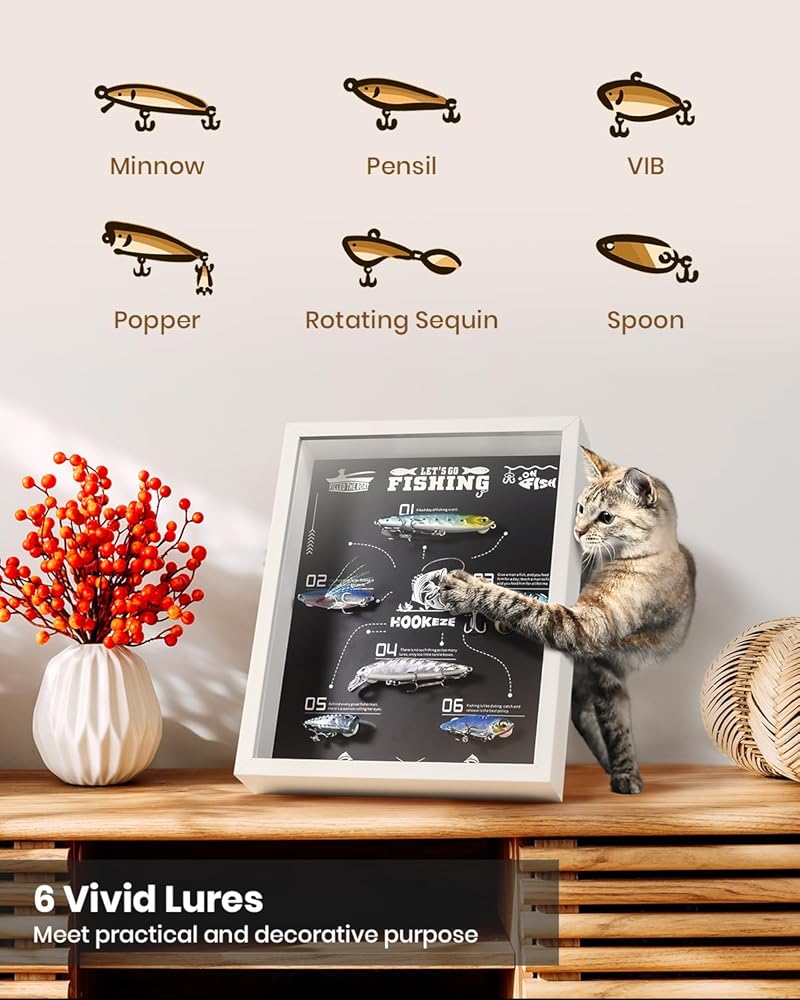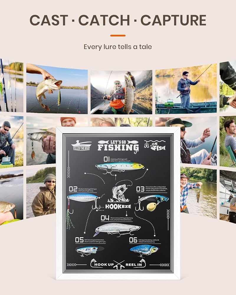 شاشة قابلة للتخصيص: مع الشريط اللاصق القابل لإعادة الاستخدام والإزالة، يدعم صندوق الظل الخاص بنا التخصيص بنفسك، مما يسمح لك باستبدال طُعم الصيد المتضمن بسهولة بمفضلاتك الشخصية. اعرض لحظات الصيد العزيزة لديك واجمع الطُعم الذي ساعدك على اصطياد الأسماك الكبيرة التي حطمت الأرقام القياسية أو فتح أنواع جديدة. ذكرى يوم الصيد العظيم.