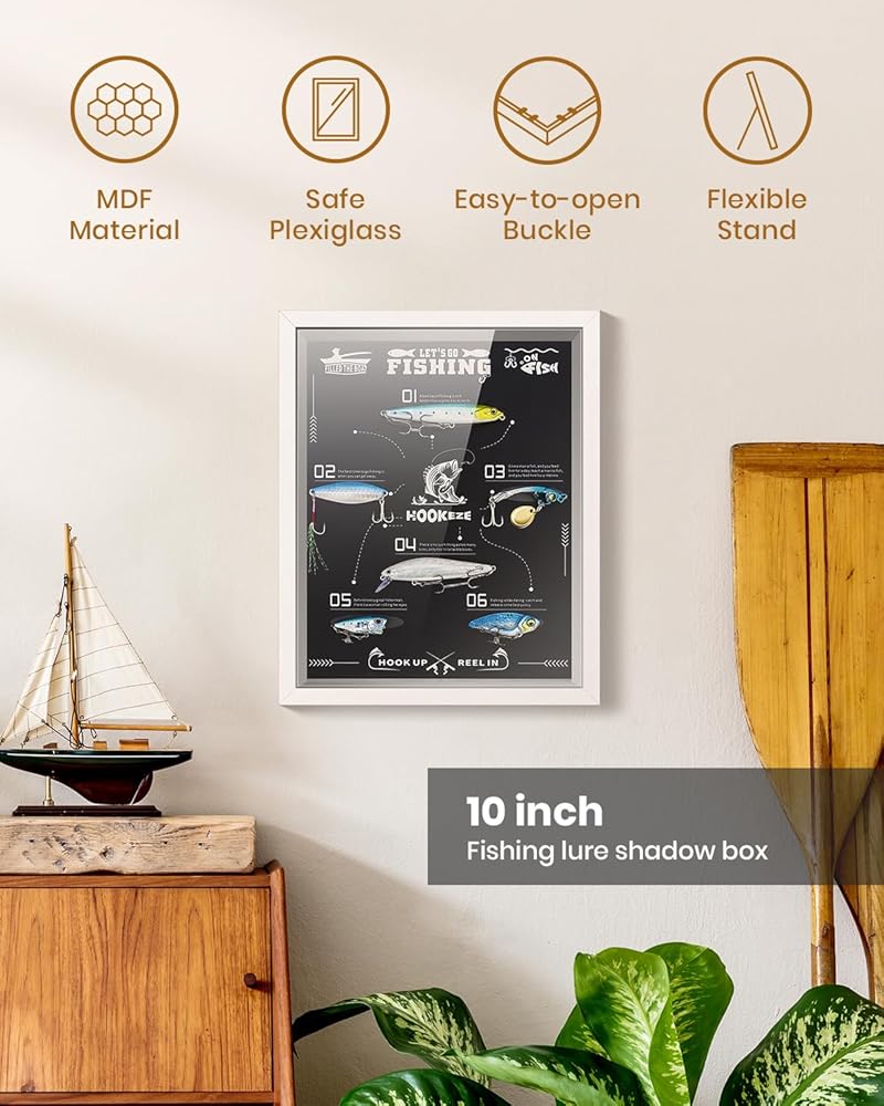 هيكل عالي الجودة: يوفر الطول 25.4 سم، والعرض 20.32 سم، وعمق إطار الصورة 1.7 سم مساحة واسعة لعرض الطُعم. مصنوع من مادة MDF المتينة ويتميز بزجاج شبكي آمن، مما يضمن المتانة والوضوح. تتميز حافظة العرض الخاصة بنا بإبزيم سهل الفتح وحامل مرن لسهولة الوصول والعرض.