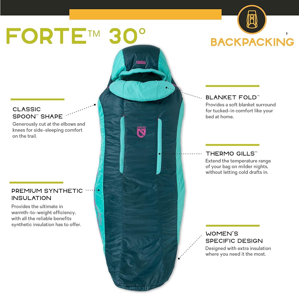 ULTRALIGHT - Backpacking sleeping bags are all about weight, which is why we made the Forte ultralight and ultra-compressible. With a minimum weight of 2 lb 9 oz and a packed size of 12 x 8.5 in dia, you'll have plenty of room in your pack for other essentials. Plus, the Forte offers luxury features, like an integrated pillow pocket.