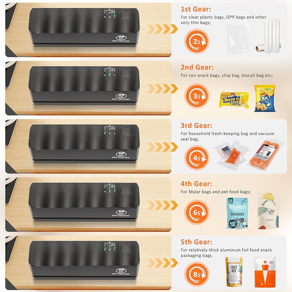 This plastic bag sealer offers five heating gears to cater to different types of bags:
