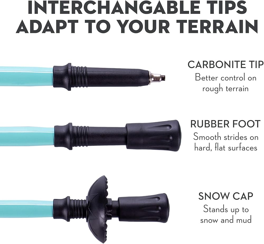 Conquer Any Terrain: 3 tip options for maximum control on any surface: carbide tip for rocky, uneven terrain; vulcanized rubber foot for hard, flat surfaces; and screw-on snow tip to keep the pole from sinking into soft ground or snow