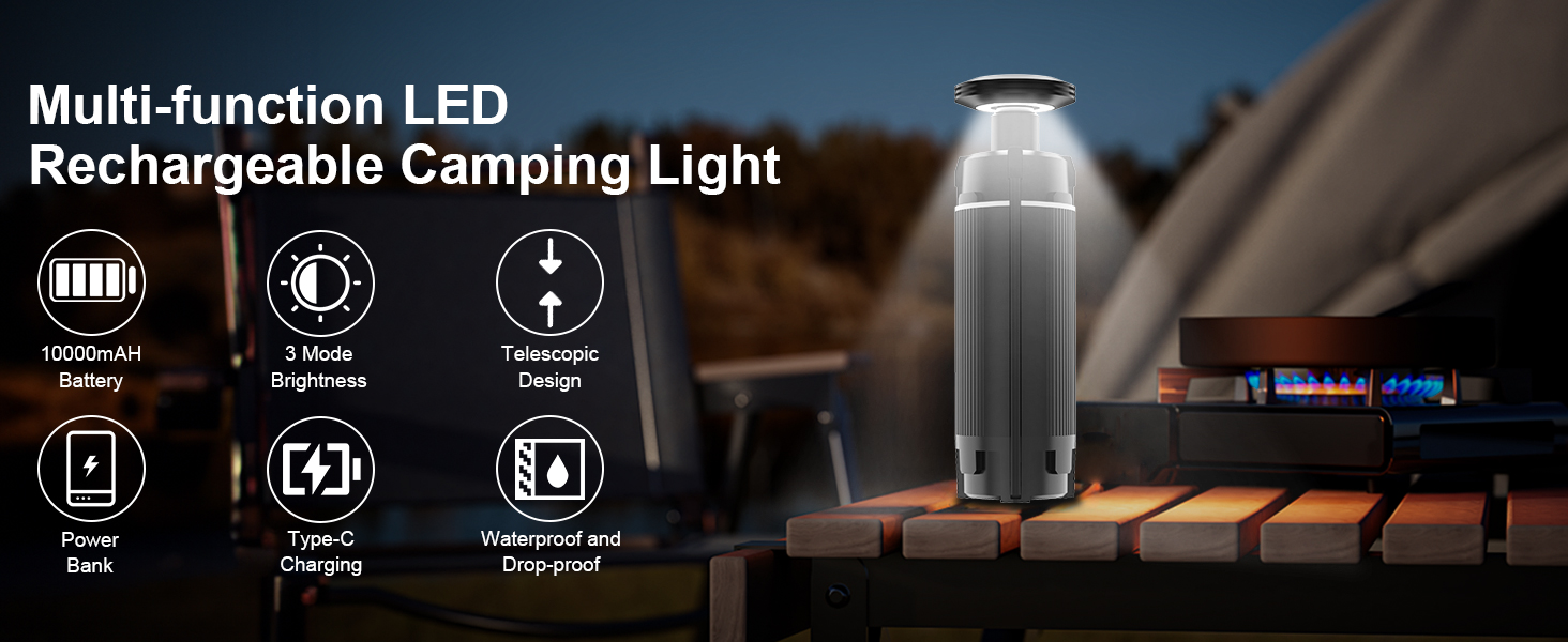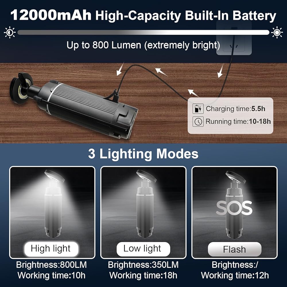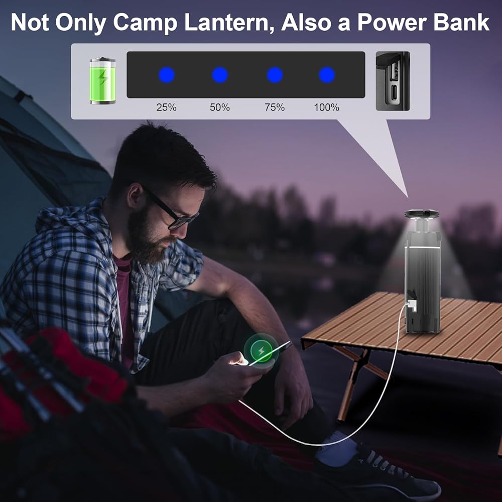 【عمر بطارية طويل ووظائف طاقة متنقلة】 تتميز مصابيح الخيمة الجديدة القابلة للسحب للتخييم بعمر بطارية مذهل. مع 5.5 ساعة فقط من الشحن، يمكن أن يدوم فانوس التخييم لمدة تصل إلى 11 إلى 18 ساعة من الاستخدام، مما يضمن حصولك دائمًا على إضاءة ساطعة أثناء الأنشطة الخارجية الطويلة. والأكثر إثارة للدهشة هو أنه يحتوي أيضًا على مصدر طاقة محمول مدمج بقدرة 12000 مللي أمبير في الساعة، والذي لا يمكنه تشغيل فوانيس التخييم نفسها فحسب، بل يوفر أيضًا دعم الطاقة لهاتفك المحمول والكمبيوتر اللوحي وأجهزة USB الأخرى.
