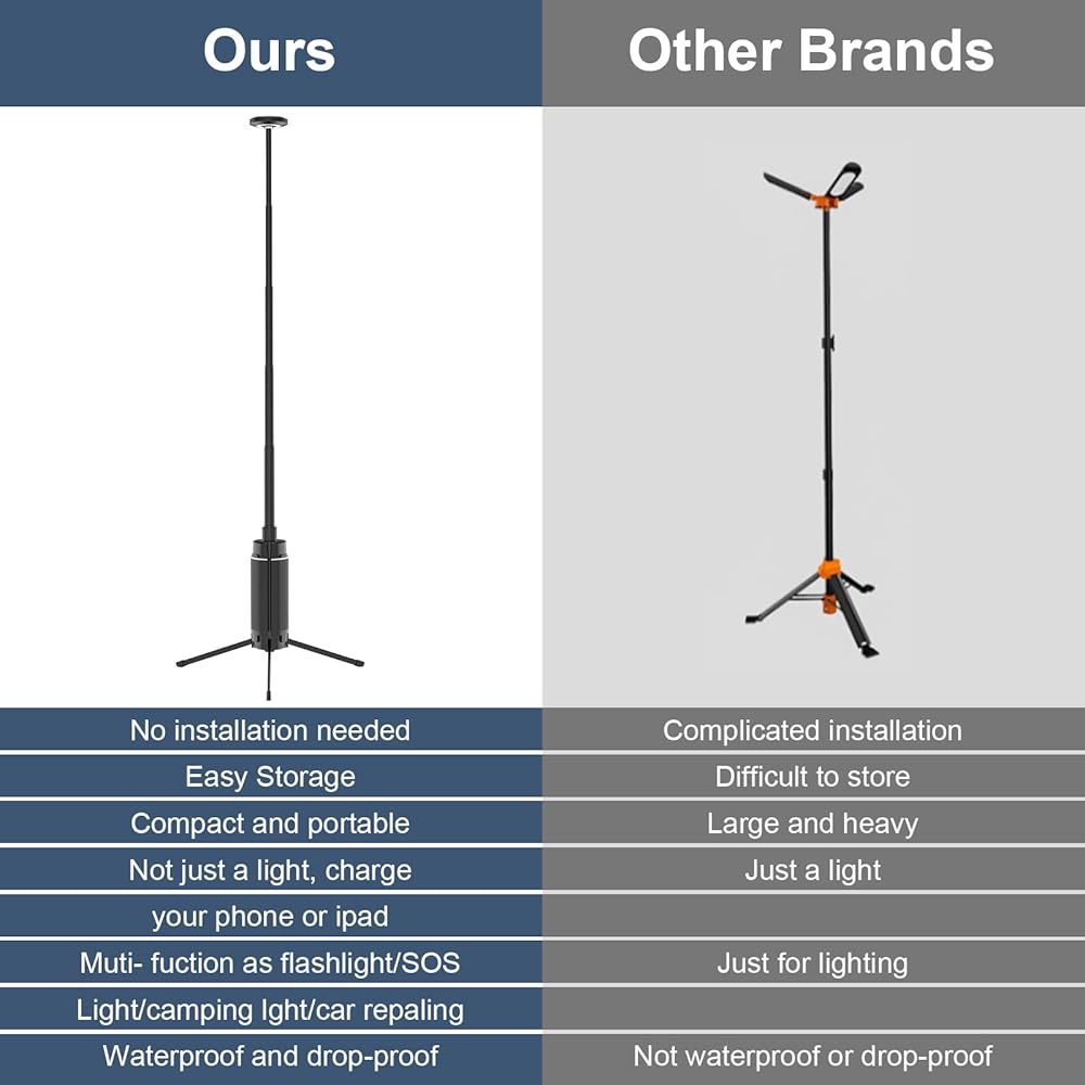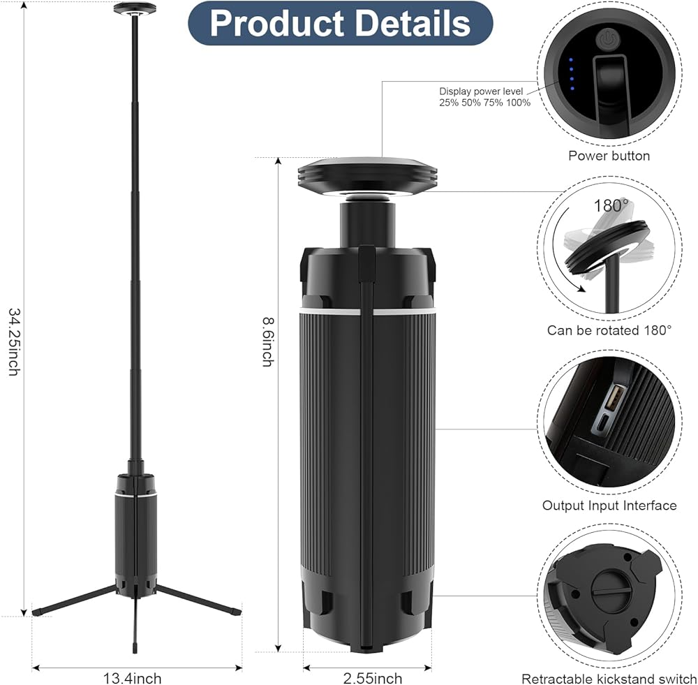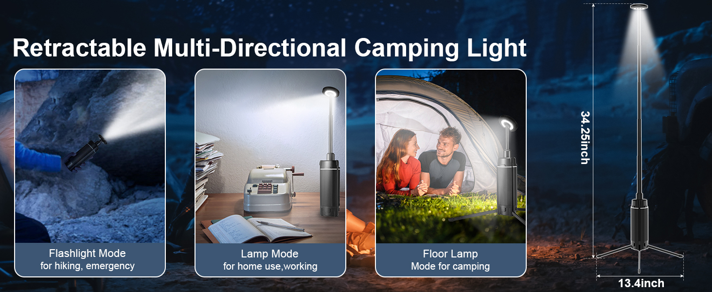 【تصميم مبتكر وقابلية للحمل】يتميز مصباح التخييم التليسكوبي القابل لإعادة الشحن بتصميم مجزأ فريد من نوعه يُحدث ثورة كاملة في شكل ووظيفة مصابيح التخييم التقليدية. مصابيح التخييم مجهزة بذكاء بخمسة أقطاب تلسكوبية (34.25 × 13.4 بوصة)، وهي ليست قابلة للتعديل بحرية فقط. في الارتفاع، ولكن أيضًا يمكن طيها بشكل مضغوط جدًا بمقاس 8.6 × 2.55 بوصة فقط، والتي يمكن وضعها بسهولة في حقائب الظهر أو حقائب السفر، ويوفر مصباح التخييم إمكانية حمل رائعة للمستكشفين في الهواء الطلق.