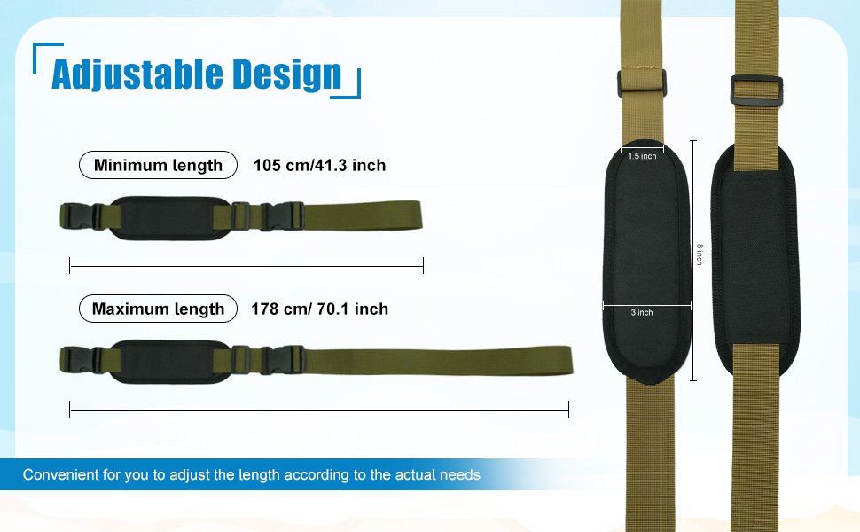 🏖️【متعددة الاستخدامات وقابلة للتعديل】تتضمن مجموعة أحزمة الحمل الخاصة بنا 4 قطع بأربعة ألوان مختلفة، كل منها بطول 70.1 بوصة وعرض 1.5 بوصة، مما يوفر التنوع والمرونة لاحتياجات الحمل المختلفة. نطاق التعديل: 41.3 بوصة (105 سم) - 70.1 بوصة (178 سم)