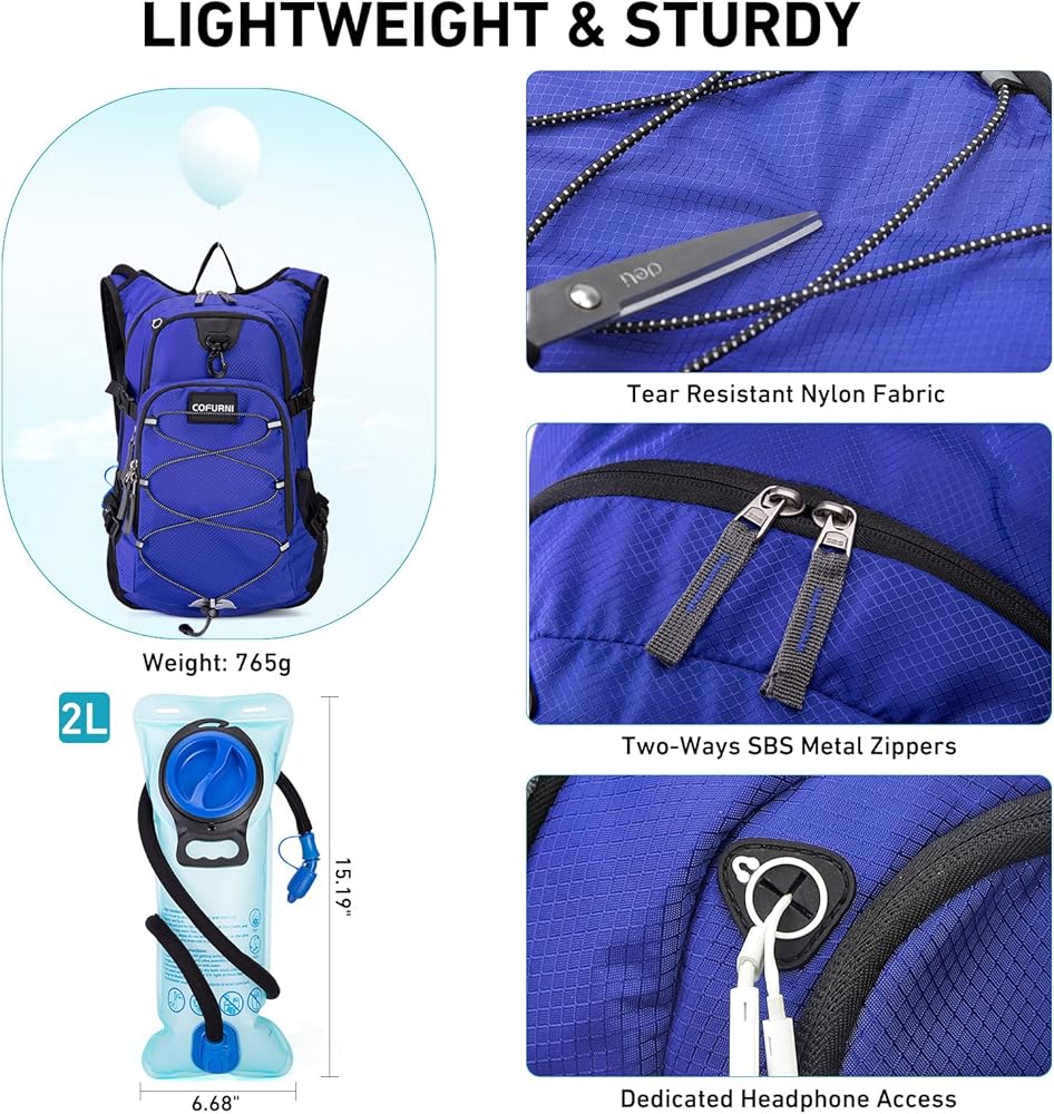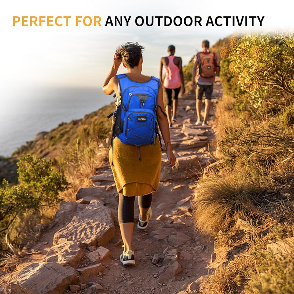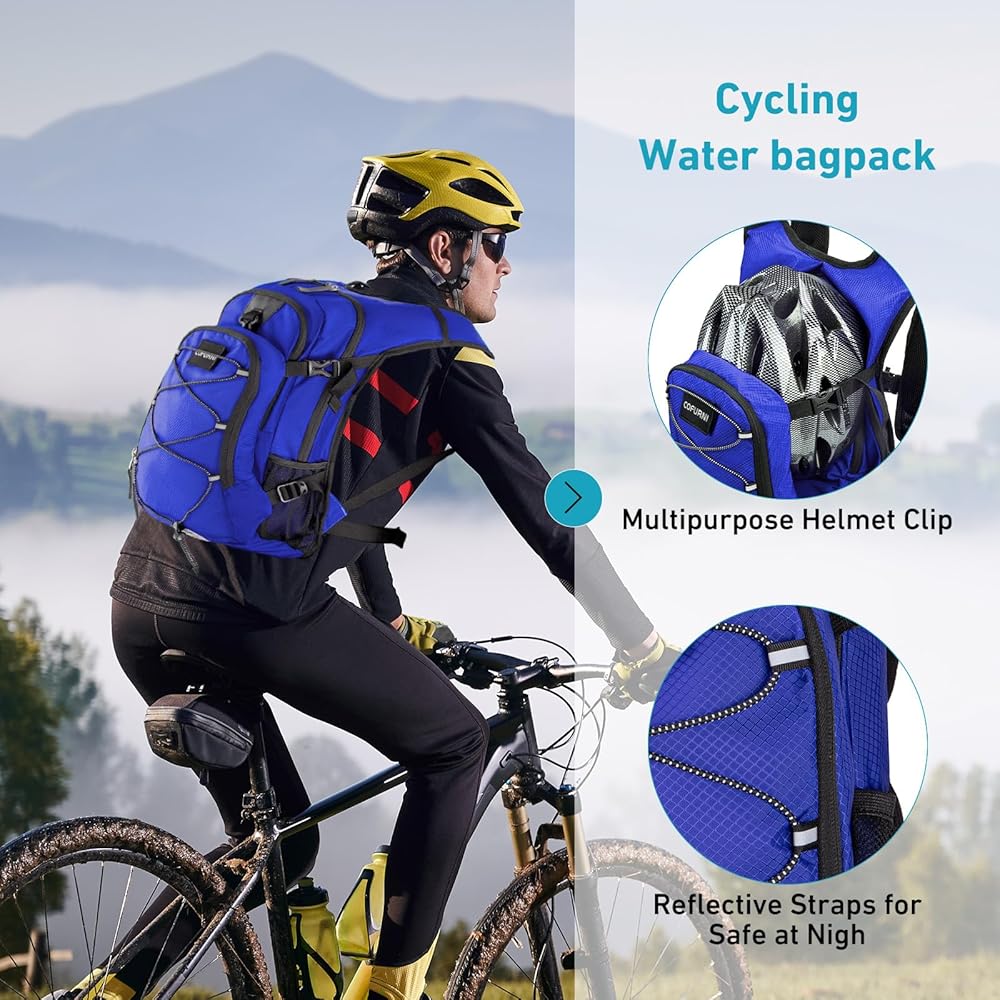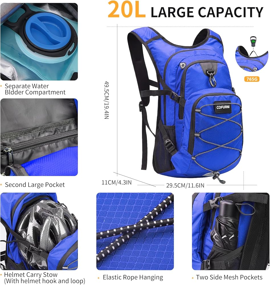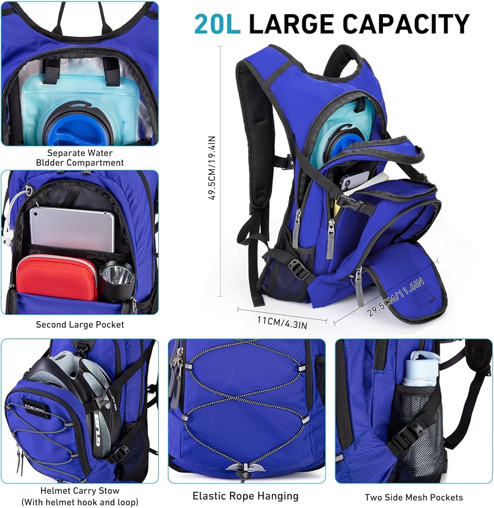 مساحة تخزين كبيرة 20 لتر: حقيبة الظهر للرحلات مجهزة بـ 4 مساحات تخزين. حجرة منفصلة معزولة مزودة بحاوية ترطيب، وفتحة كبيرة جدًا لسهولة تحميل نظام المثانة المائية. حجرة أمامية كبيرة لأمتعة الرحلات، والحجرة الأمامية الثانية للأغراض الصغيرة، وحقيبة الظهر المرطبة خفيفة الوزن تأتي أيضًا مع مشبك خوذة وجيبين شبكيين على جانبي حقيبة الظهر، وأعمدة المشي لمسافات طويلة، وخوذة الدراجة، وإضاءة الدراجة، وسجادات النوم أو السترات. يمكن تركيبها.
