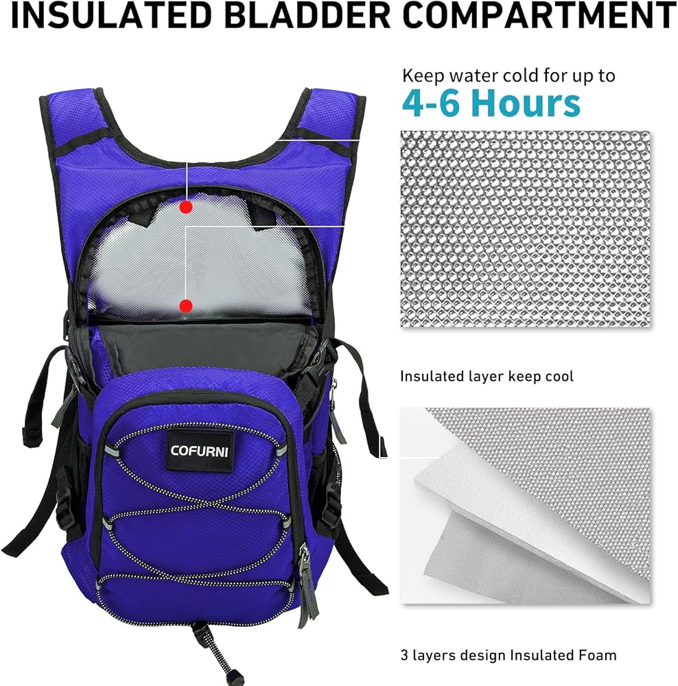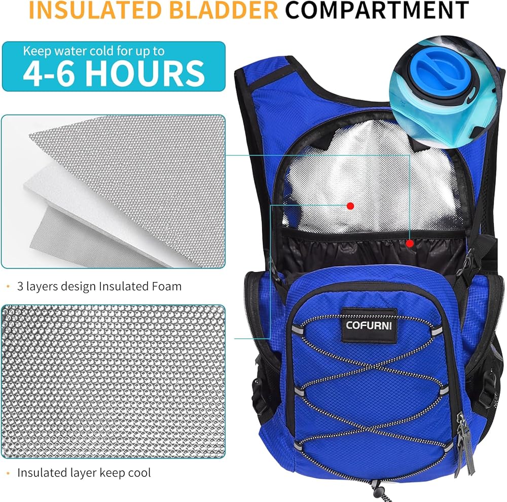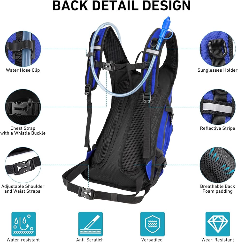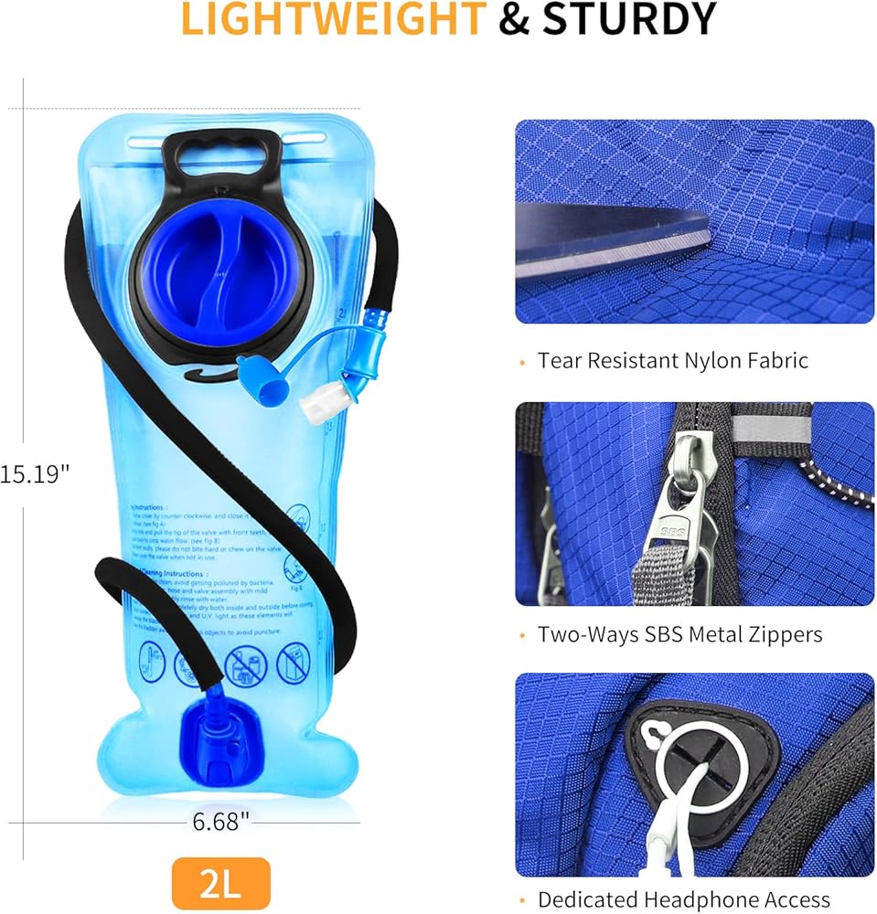 نظام ترطيب مثالي: تحتوي حقيبة الظهر للدراجة المزودة بمثانة ترطيب على كيس ماء سعة 2 لتر مصنوع من مادة آمنة للطعام وخالية من مادة BPA بنسبة 100%، ويمكنها تخزين درجات حرارة الماء من أقل من 10 درجات مئوية إلى 30 درجة مئوية. تحتوي حقيبة الظهر على حجرات منفصلة معزولة للحفاظ على الماء باردًا لمدة تصل إلى 4-6 ساعات. مدخل مياه مقاس 3.1 بوصة وخرطوم قابل للفصل لسهولة صب واستخدام الثلج وتنظيفه. أنبوب شرب بدون استخدام اليدين مع قطعة فم شفط، عض بلطف للحفاظ على تدفق السائل.