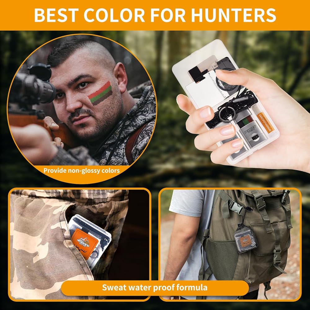 مجموعة طلاء الوجه المموه، طلاء وجه صيد مقاوم للماء والعرق، تتضمن عبوتين من مكياج الصيد المموه، ومرآة حمل، وبوصلة، وحلقة على شكل حرف D، وحاوية تخزين صغيرة وحقيبة شبكية برباط