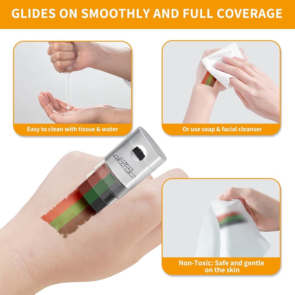 فعال يدوم طويلاً - يضمن الملمس الملطخ والمقاوم للماء أن طلاء وجهك لن يتلطخ بالتعرق أو المطر أو أي أشكال أخرى من الرطوبة. يوفر تغطية طويلة الأمد، مما يضمن إخفاء فعال أثناء مغامرتك الخارجية