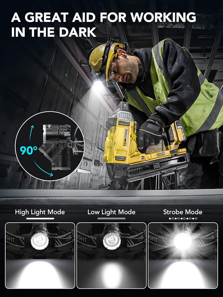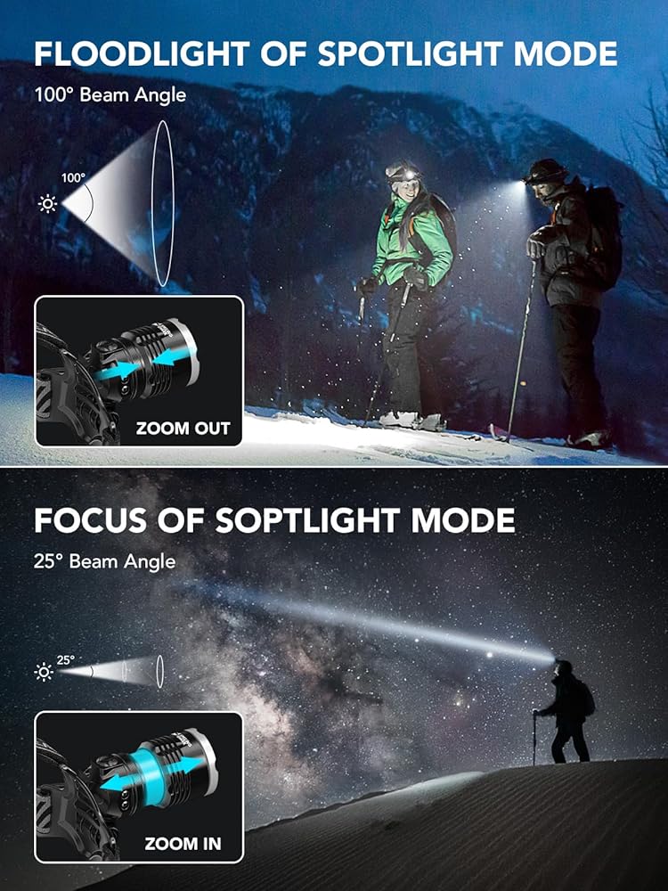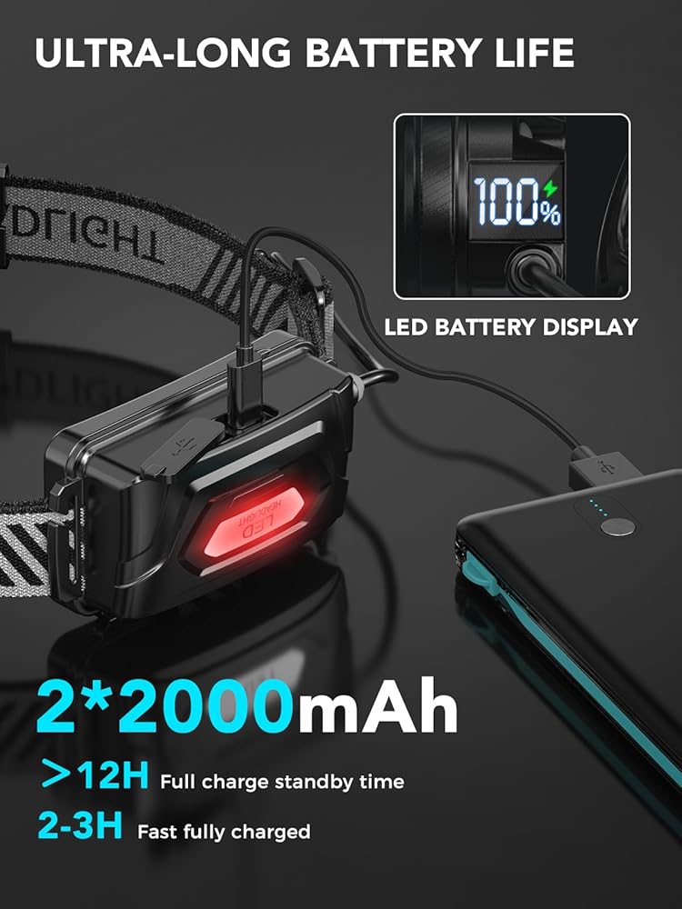 🔋【قوة تحمل طويلة للغاية وشاشة LED للبطارية】بطارية مدمجة 2*2200 مللي أمبير في الساعة، يستغرق مصباح الرأس LED 2-3 ساعات للشحن السريع بالكامل، ويمكن أن يوفر أكثر من 12 ساعة من عمر البطارية المستمر بعد الشحن الكامل. تساعدك شاشة بطارية LED الموجودة على الرأس على رؤية المستوى الحالي للطاقة بوضوح.