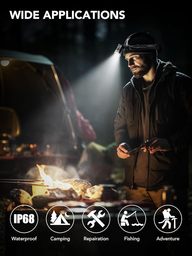 🌃【𝗣𝗲𝗿𝗳𝗲𝗰𝘁 𝗙𝗼𝗿 𝗡𝗶𝗴𝗵𝘁 𝗔𝗰𝘁𝗶𝘃𝗶𝘁𝗶𝗲𝘀】سواء كنت تقوم بالتخييم أو المشي لمسافات طويلة أو صيد الأسماك أو الحرف اليدوية حسنًا، يوفر المصباح الأمامي مقدارًا مثاليًا من الضوء لجميع أنشطتك الليلية.