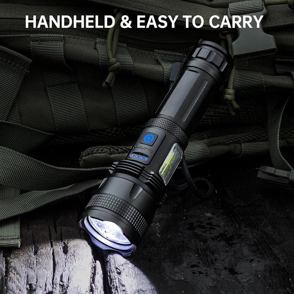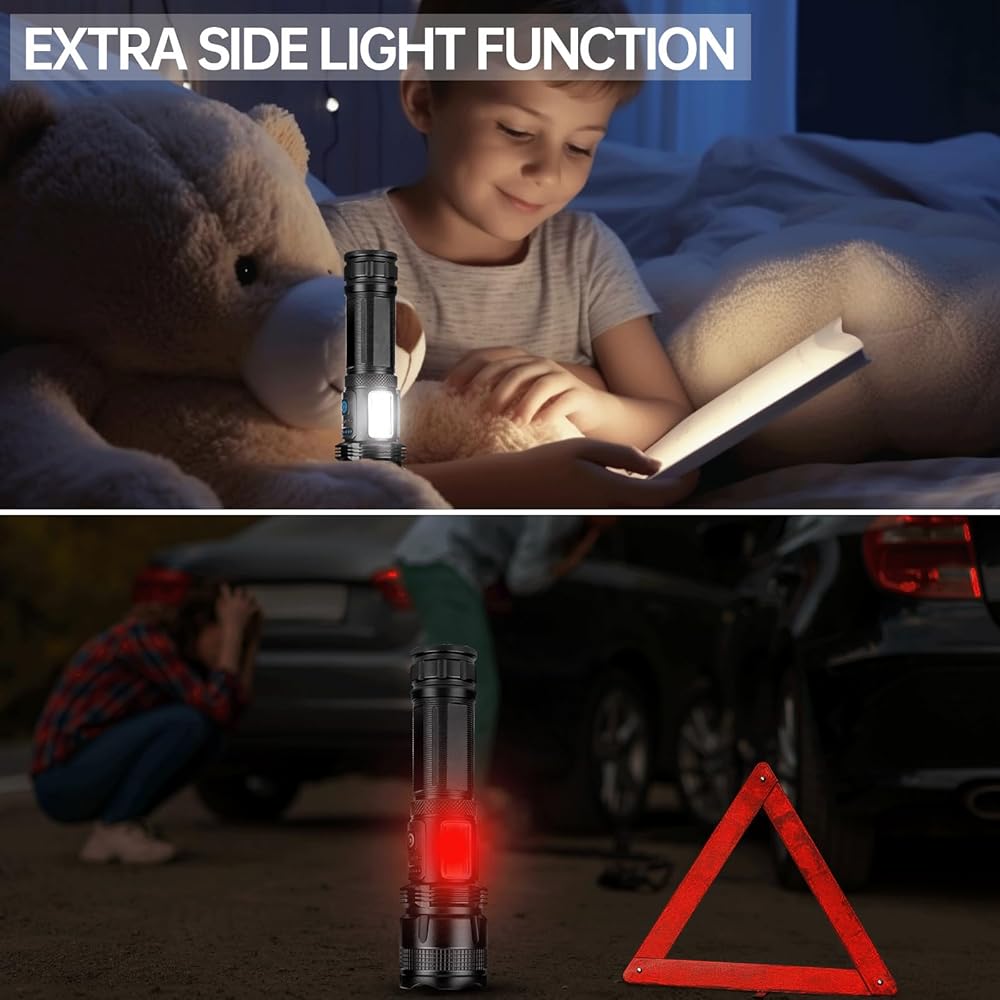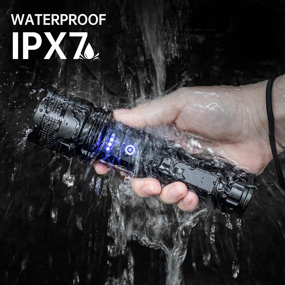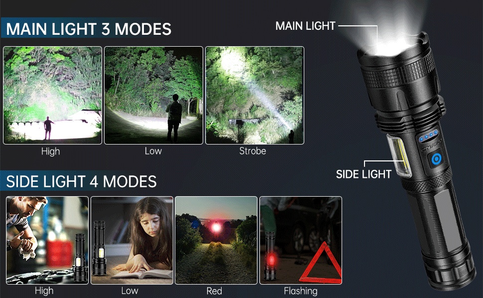 وظيفة Telesocpic ومقاومة للماء IPX7: يمكننا تمديد رأس المصباح اليدوي لضبط البؤرة واختيار الضوء لمسافات طويلة (5000 قدم) أو الضوء الكاشف لمساحة كبيرة (200 قدم مربع) بحرية. يستخدم المصباح اليدوي المقاوم للماء حلقة إغلاق مطاطية سميكة تتميز بأداء أفضل مقاوم للماء وليس من السهل أن يغزوها الماء.