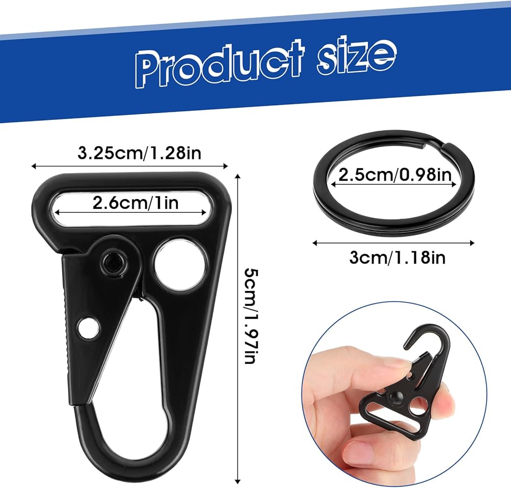 Package Component: 8 sets black zinc alloy keychain clips, 8 pieces sling hooks and 8 pieces key rings.