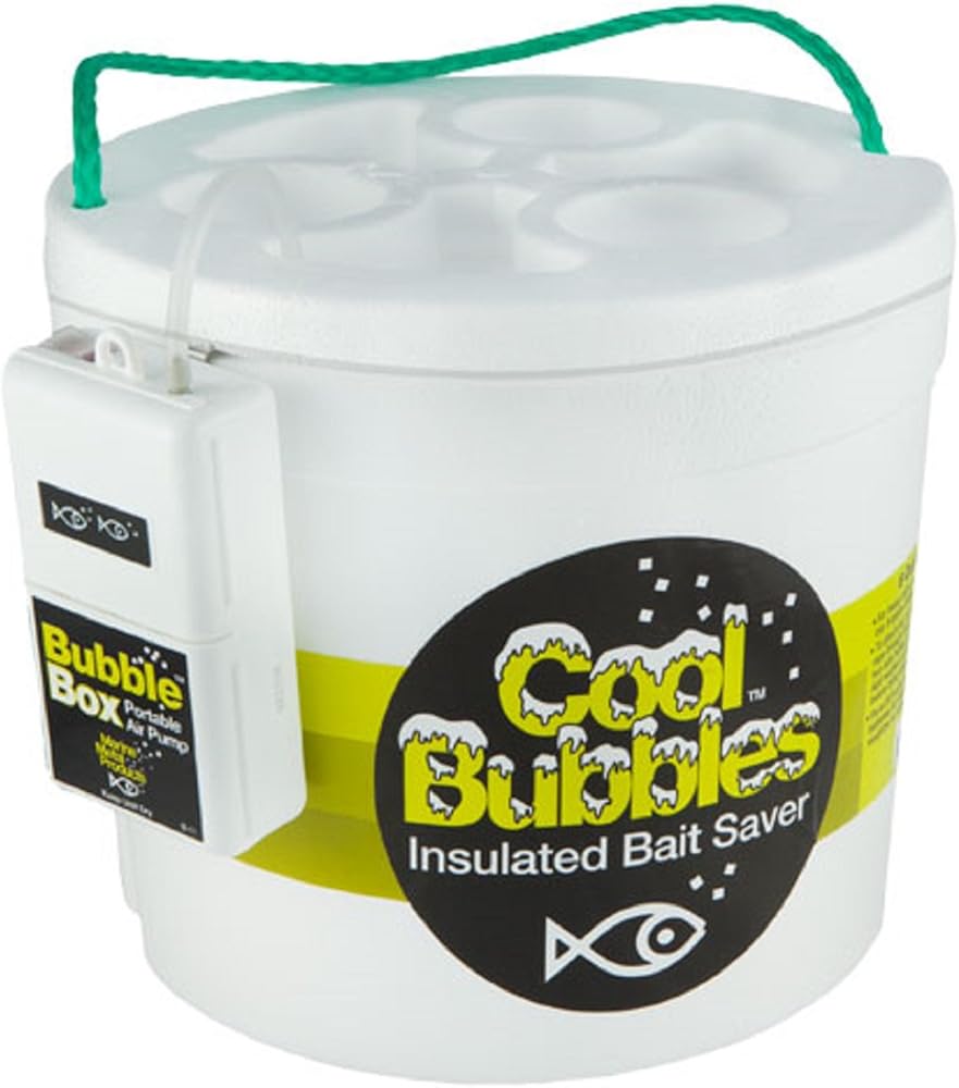 The Cool Bubbles bait bucket kit includes an extra thick foam liner for the insulated bucket with rope handle and a Bubble Box aerator. This exceptional, easy to use Bubble Box aeration pump comes with 24 inches of airline tubing and a weighted air stone for use in any bait bucket up to 5 gallons. It is designed to work in both fresh and saltwater and is great for ice-fishing. Key factors for keeping bait fish, minnows and shrimp alive and lively include proper aeration, water temperature maintenance and controlling water acidity. The cool bubbles insulated bait bucket kit with air bubbler is ideal for proper aeration and maintaining constant water temperature; changing the water in the bait bucket and removing dead bait helps control acidity. The precision motor on the bubble box runs approximately +/- 44 hours on 2 alkaline D batteries (not included) but will also operate +/- 22 hours with just one battery. The aerator pump provides 1.4 STL of air/minute.