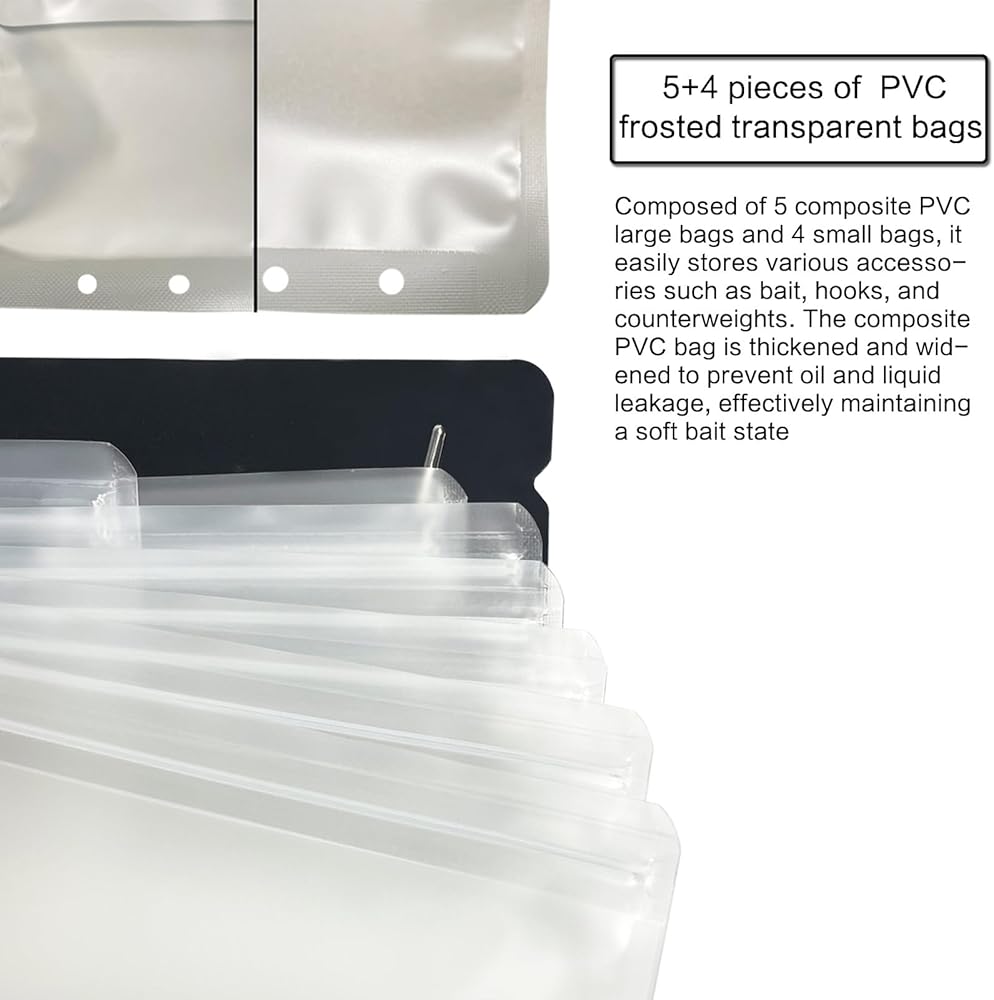 【حافظة طعم سهلة الوصول】9 جيوب للطعم من البولي فينيل كلوريد سهلة الوصول توفر مساحة تخزين عالية السعة للطعوم البلاستيكية الناعمة، وتحافظ على تنظيم أدوات الصيد الخاصة بك. تتيح حقيبة الطعم هذه سهولة التمييز بين الأنواع المختلفة من الطعوم الناعمة، كما أنها توفر مكانًا لتخزين الخطافات والأوزان المختلفة. يمكن أن يستوعب حل تخزين طُعم الصيد هذا كل شيء بدءًا من الخطافات وحتى الخيوط، مما يمنحك مرونة إضافية في مطاردة الأسماك المستهدفة.