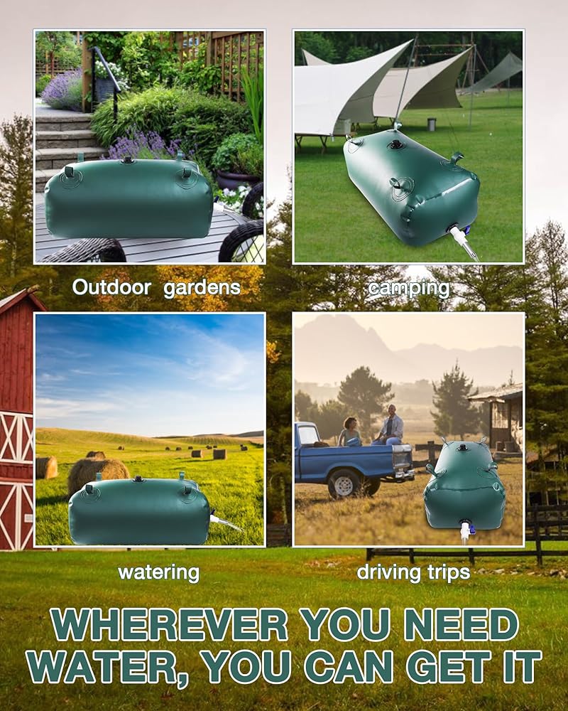 تطبيق واسع: سواء كنت تعمل في البستنة أو الزراعة أو في الهواء الطلق أو في الداخل، فإن خزان المياه مثالي لضمان إمداد ثابت من الماء. يمكن أن تكون حقيبة تخزين المياه رفيقك في السفر. يمكن أيضًا استخدام حاويات المياه في حالات الطوارئ المائية مثل الجفاف والحرائق. مع وجود الحاويات بجانبك، فمن المؤكد أنك ستحل مخاوفك.