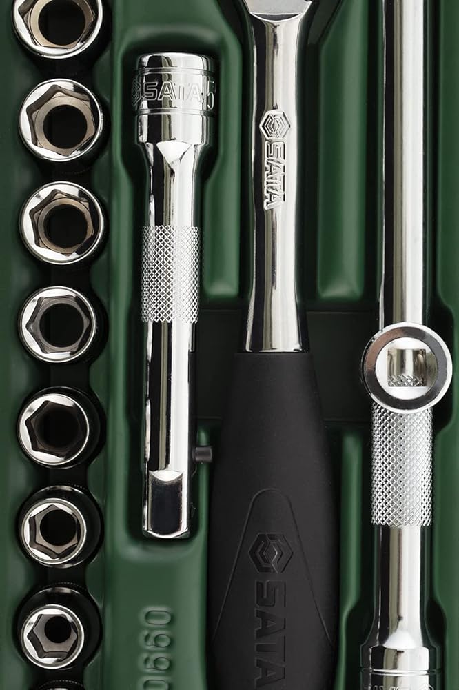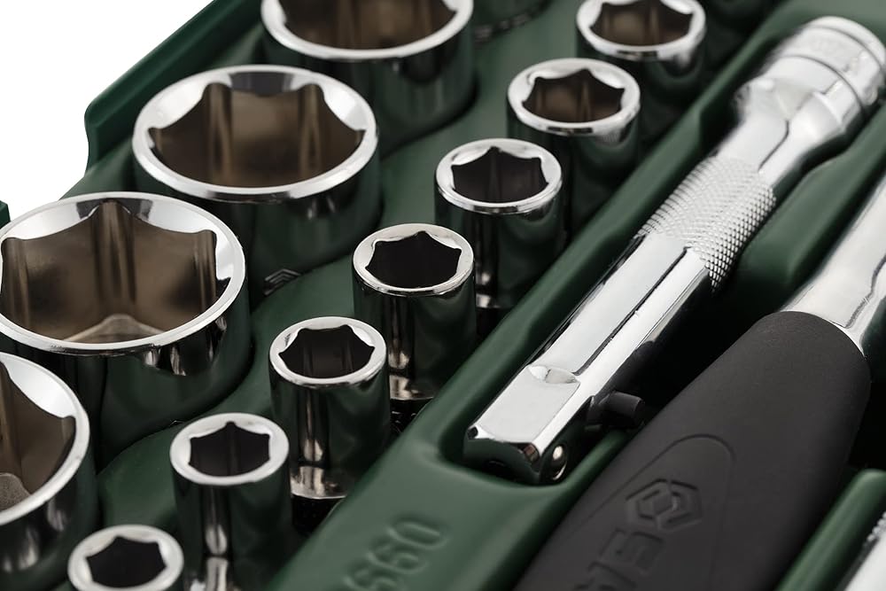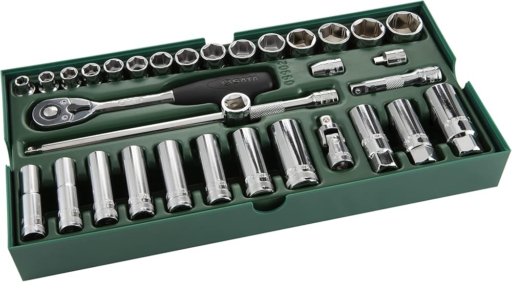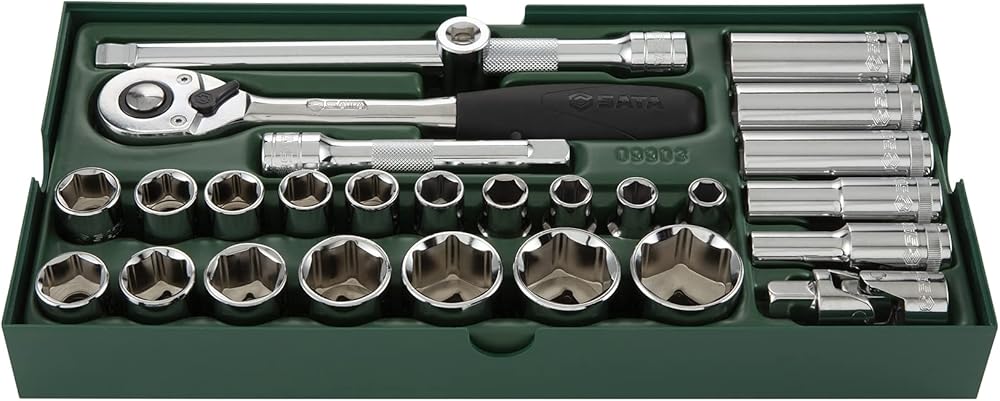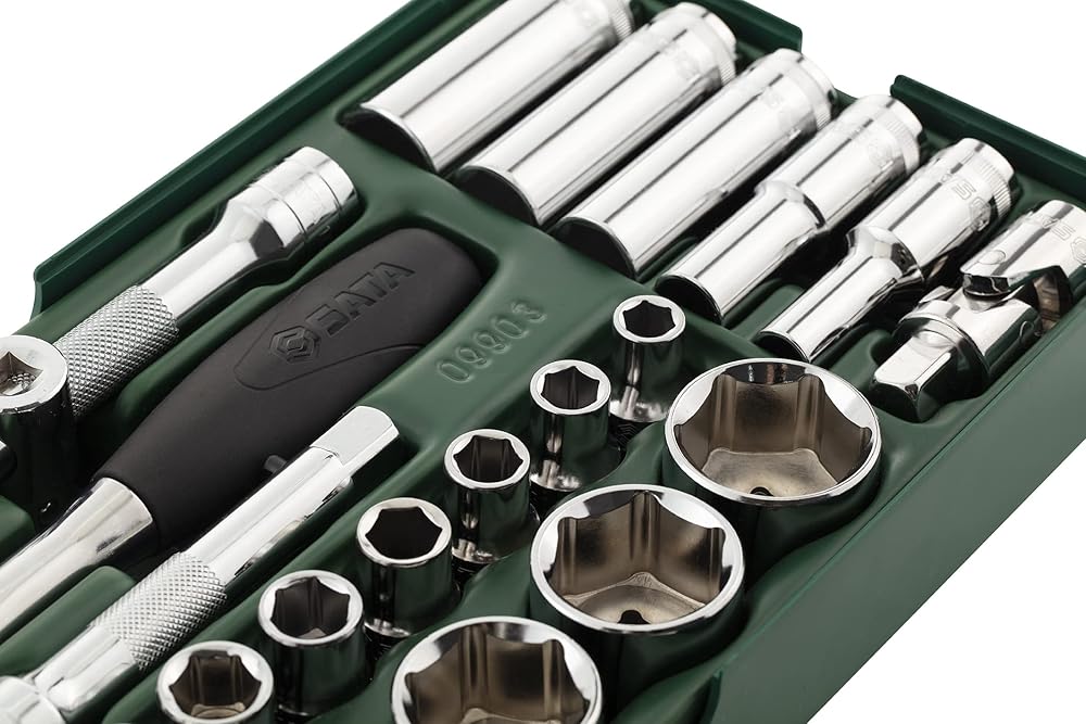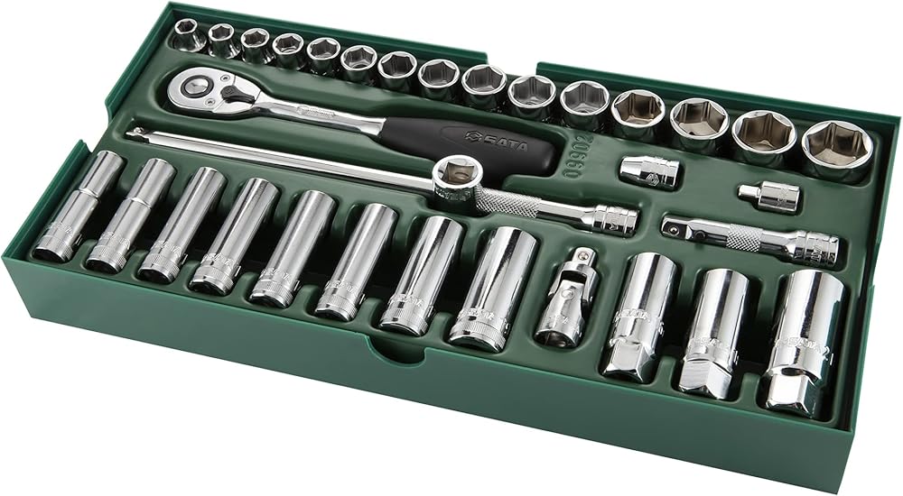 - Includes: 17 - 1/2" 6Pt. Metric Sockets: 10, 11, 12, 13, 14, 15, 16, 17, 18, 19, 21, 22, 24, 27, 30, 32, 34 mm 5 - 1/2" 6Pt. Metric Deep sockets: 10, 13, 17, 19, 22 mm 5 - Accessories 1/2" Quick-Release Ratchet 1/2" Wobble Extension 6" 1/2" Universal Joint 1/2" Locking Extension 5" 3/8"F x 1/2"M 3-Way Adapter
