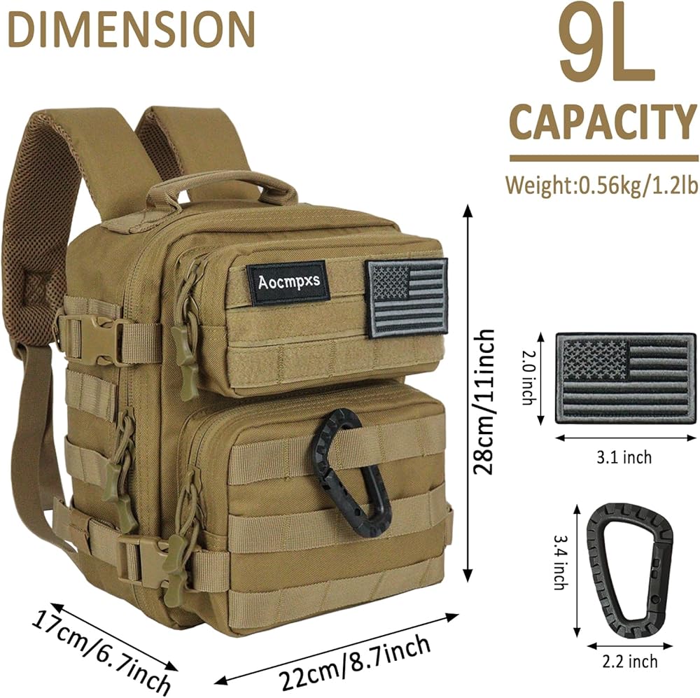 • 【حقيبة ظهر صغيرة سعة 9 لتر】حقيبة ظهر تكتيكية صغيرة الحجم: 11 بوصة (ارتفاع) × 8.7 بوصة (عرض) × 6.7 بوصة (عمق)، السعة 9 لتر. تتضمن حجرة رئيسية واحدة تناسب وسادة مقاس 7.9 بوصة، وجيبين أماميين وزجاجة واحدة جيوب جانبية شبكية تناسب زجاجة 750 مل من حقيبة الظهر الصغيرة من Aocmpxs تسمح لك بوضع جميع الضروريات تقريبًا في الداخل.