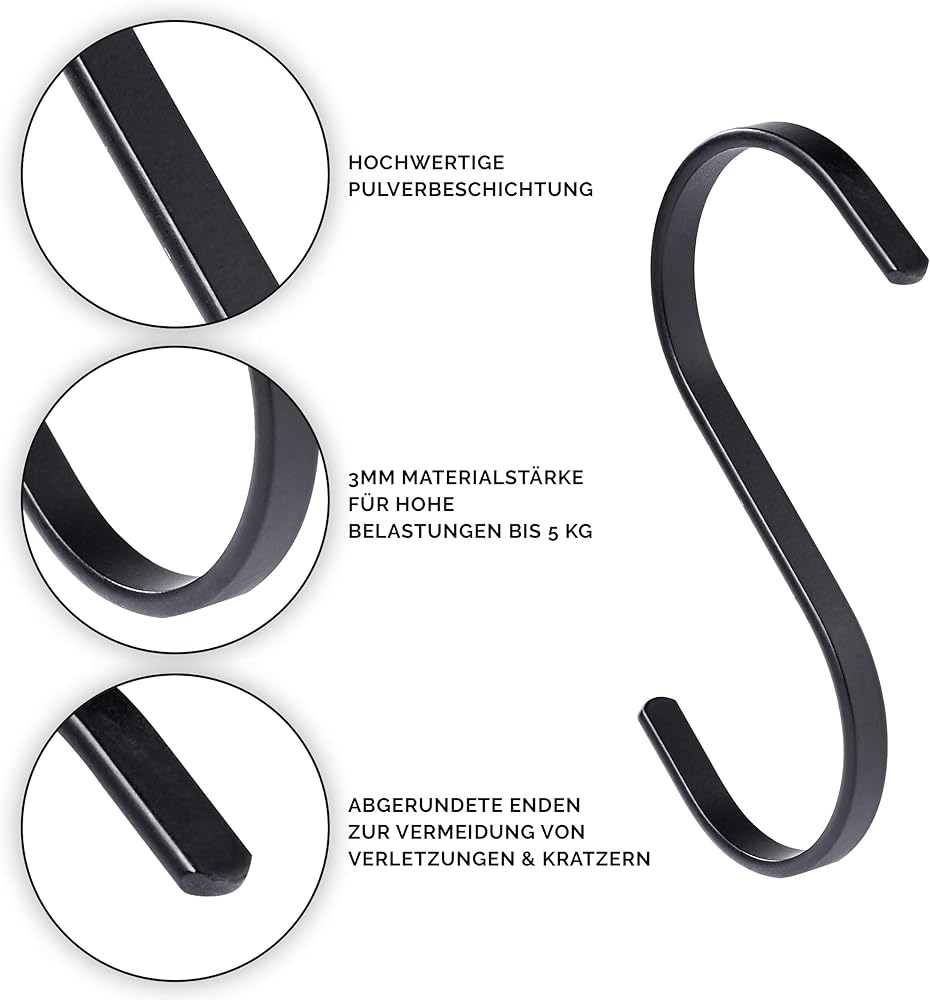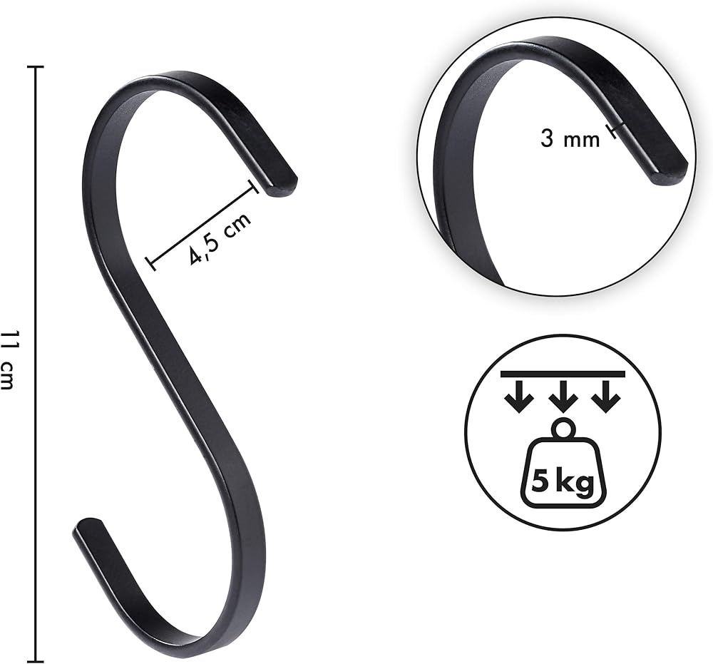 • شديدة التحمل - يمكن لخطافات التعليق السوداء أن تحمل أشياء ثقيلة ويمكن استخدامها كخطافات للنباتات أو خطافات لرف الأواني. يمكن للخطافات السوداء أن تحتوي على أواني طهي ثقيلة من الحديد الزهر. مثالية كأواني الخطافات