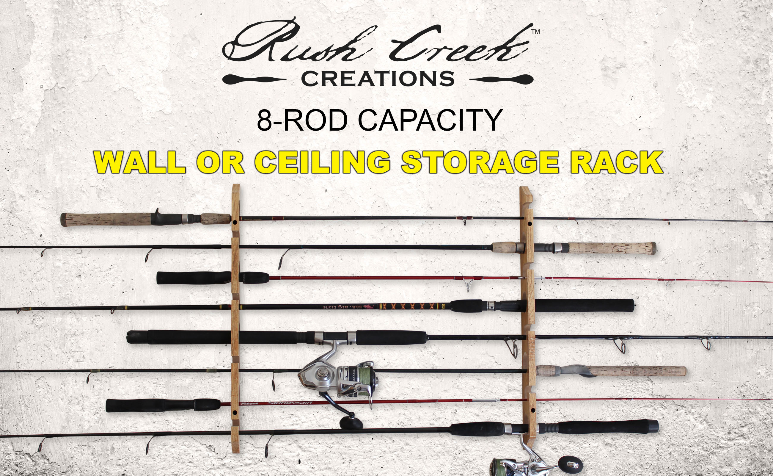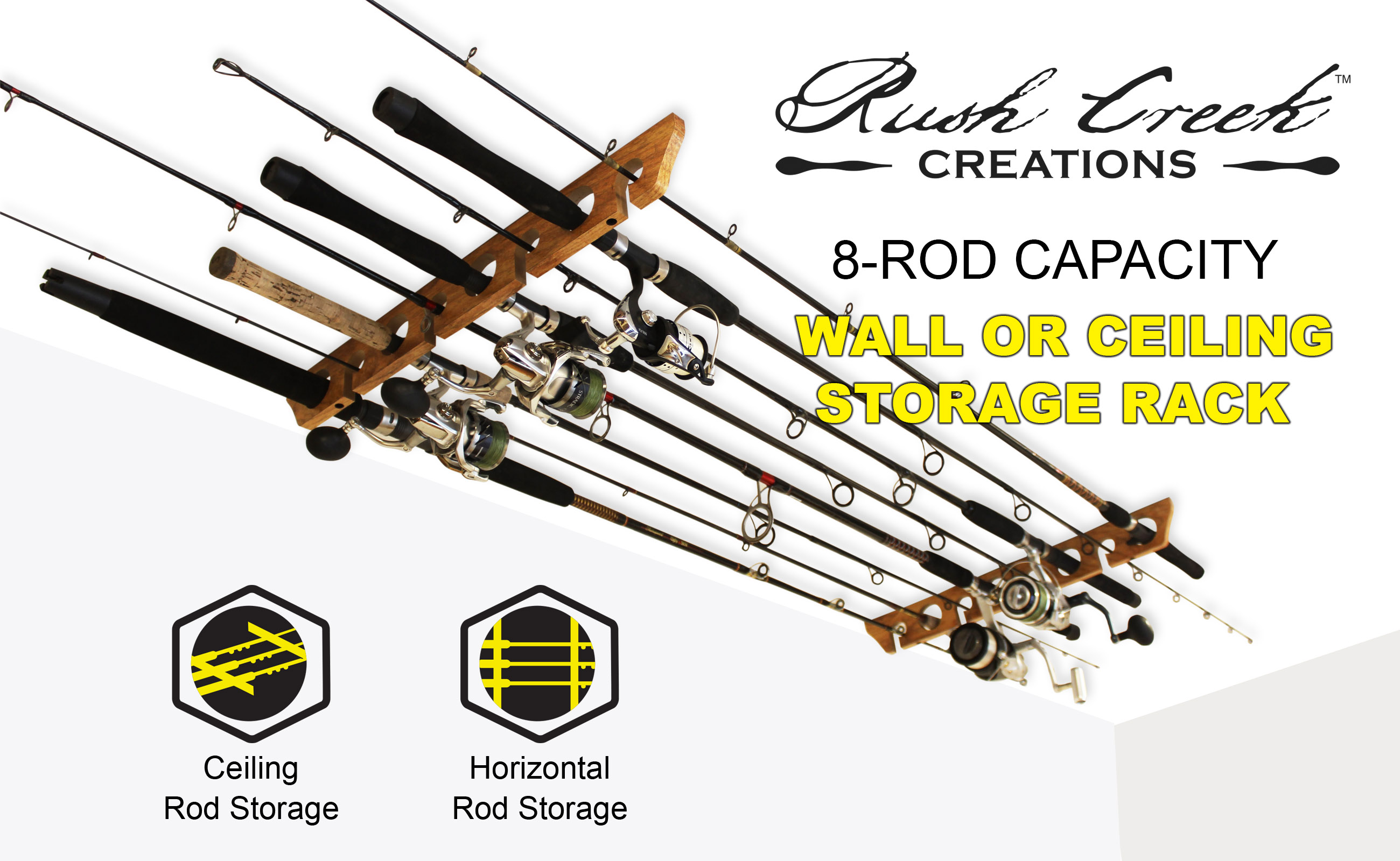 Organize your fishing rods anywhere you need with the Rush Creek Creations 8-Rod Fishing Pole Holder Wall or Ceiling Rack Twin Pack. This efficient fishing pole holder stores up to 8 fishing poles with deep grooves to ensure your rods remain securely in place. Mount it on the wall or ceiling thanks to the sleek, space-saving design. Featuring a classy design, you can choose the rod holder pack that best suits your tastes and adds flair to your home, garage or shed. This twin pack contains two fishing rod wall racks, each fishing rod holder measuring 23.46"L X 2.76"W X 0.59"H.
