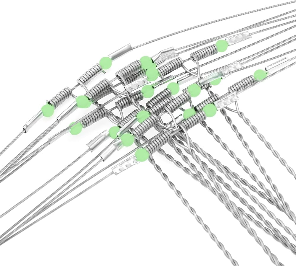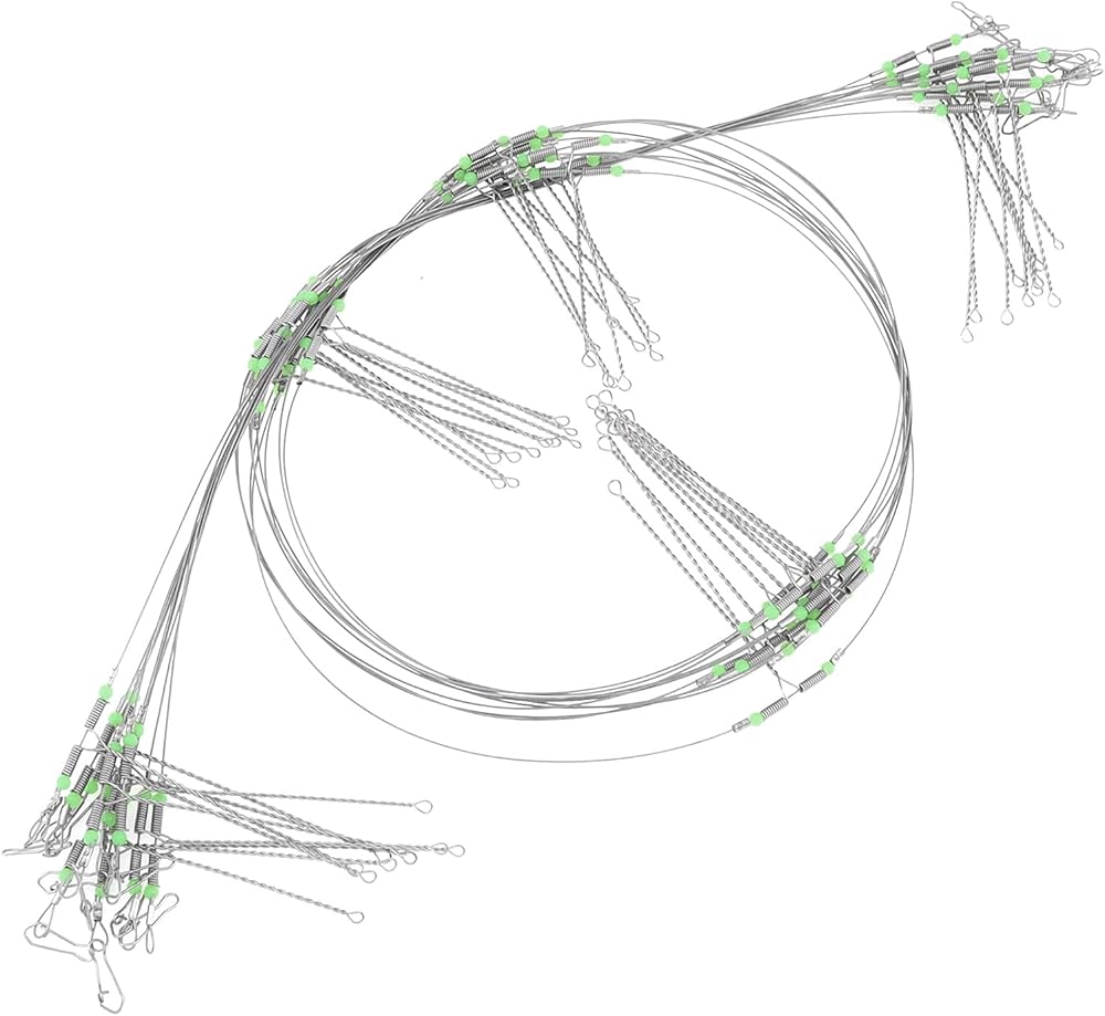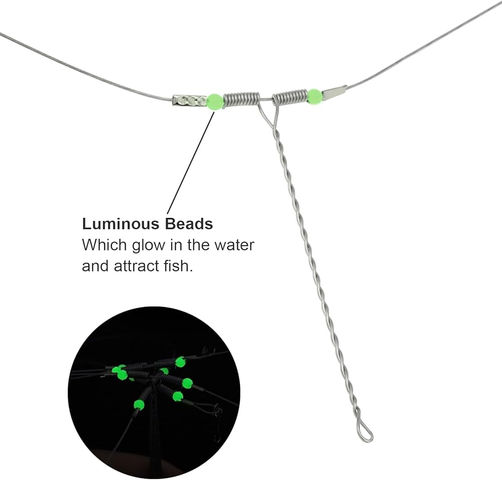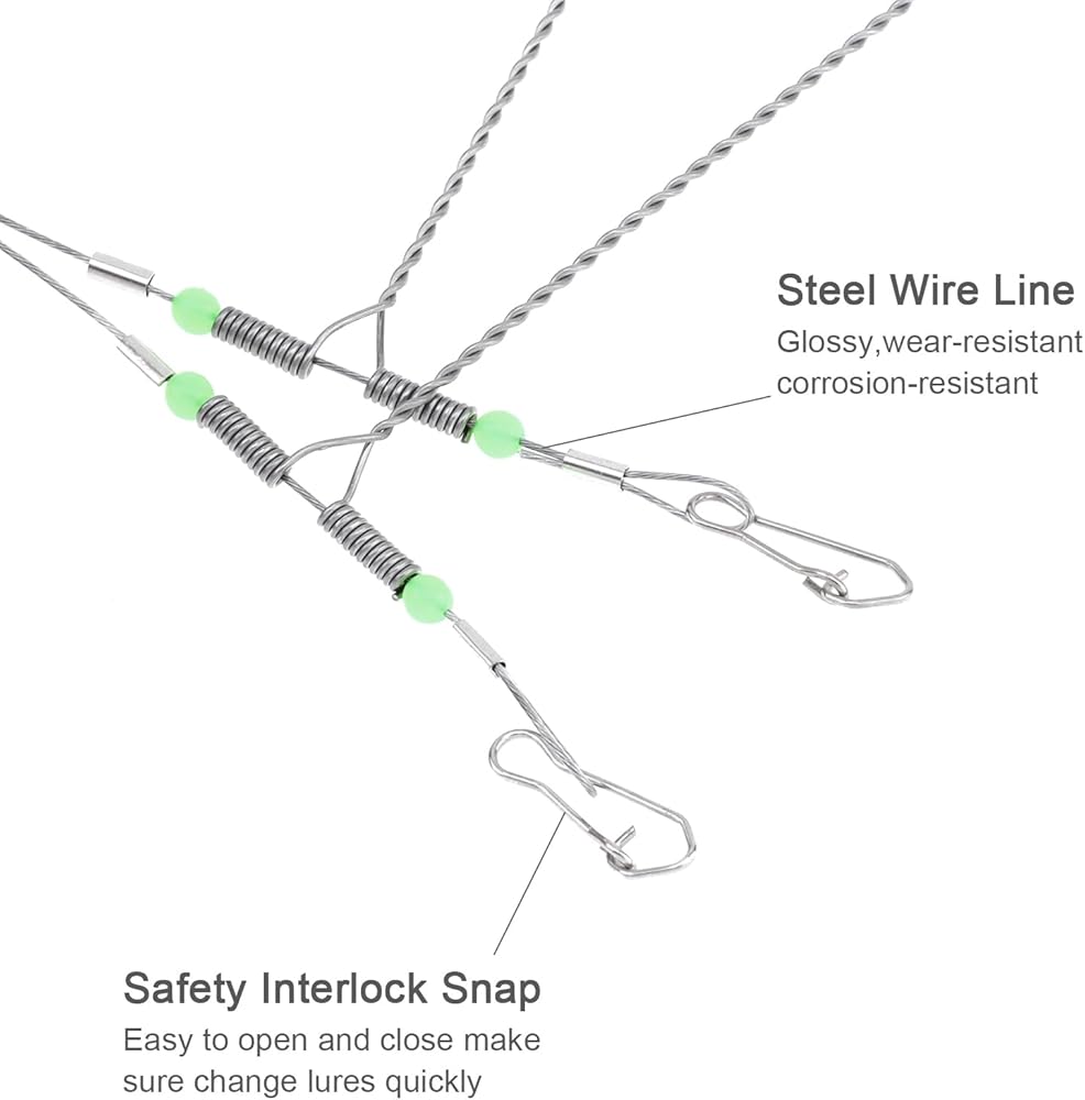【Package content】10Pcs stainless steel anti winding fishing leaders wire with 3 Arms, equipped with high-quality snaps, and luminous green beads.