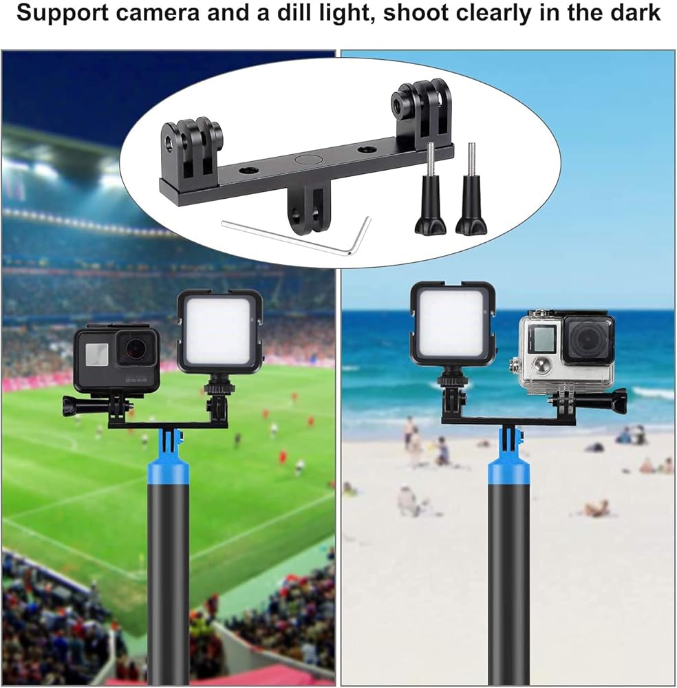 يمكن تركيب كاميرتين رياضيتين في نفس الوقت، مثل كاميرات سلسلة جو برو ودي جيه اي اوسمو وما إلى ذلك. حافظ على كلتا الكاميرتين في نفس المستوى الأفقي عند التصوير. يدعم أيضًا الكاميرا وإضاءة التعبئة، والتقاط الصور بوضوح في الظلام.
