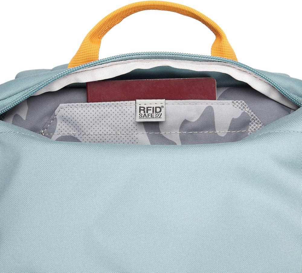 ORGANIZATION - Roomy main compartment opens suitcase style, with X-shaped compression strap to fix items in place. Front zippered compartment. Hidden top compartment with RFID-blocking pocket and key & wallet clip. Side pocket for umbrella or water bottle.