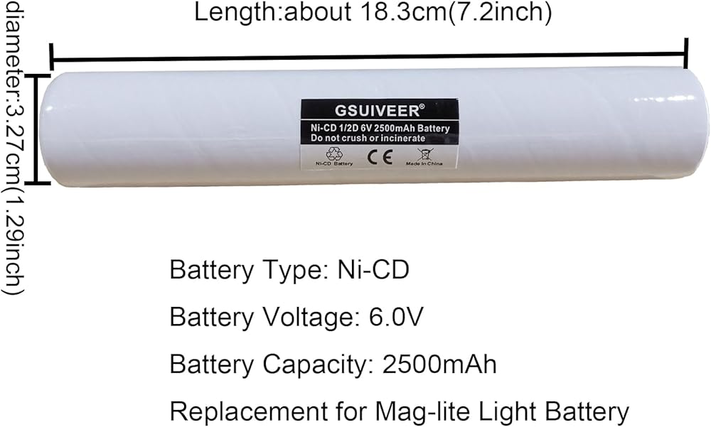 • 1. نوع البطارية: Ni-CD، جهد البطارية: 6.0 فولت؛ سعة البطارية: 2500 مللي أمبير، العبوة تشتمل على: 1 × بطارية Ni-CD 6 فولت 2500 مللي أمبير في الساعة بديلة متوافقة مع Streamlight SL20، SL20X، SL20S، SL20XP LED، SL20X-LED، SL-20XP-LED، 20170، 201701، 20175، 15X1701، 20X1701