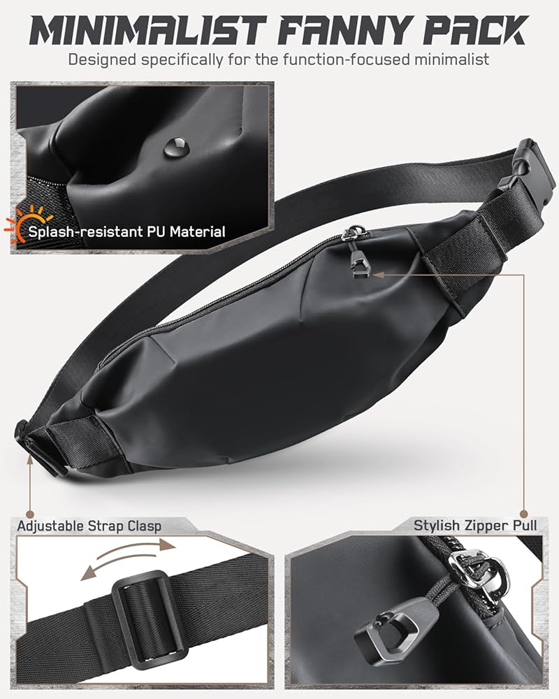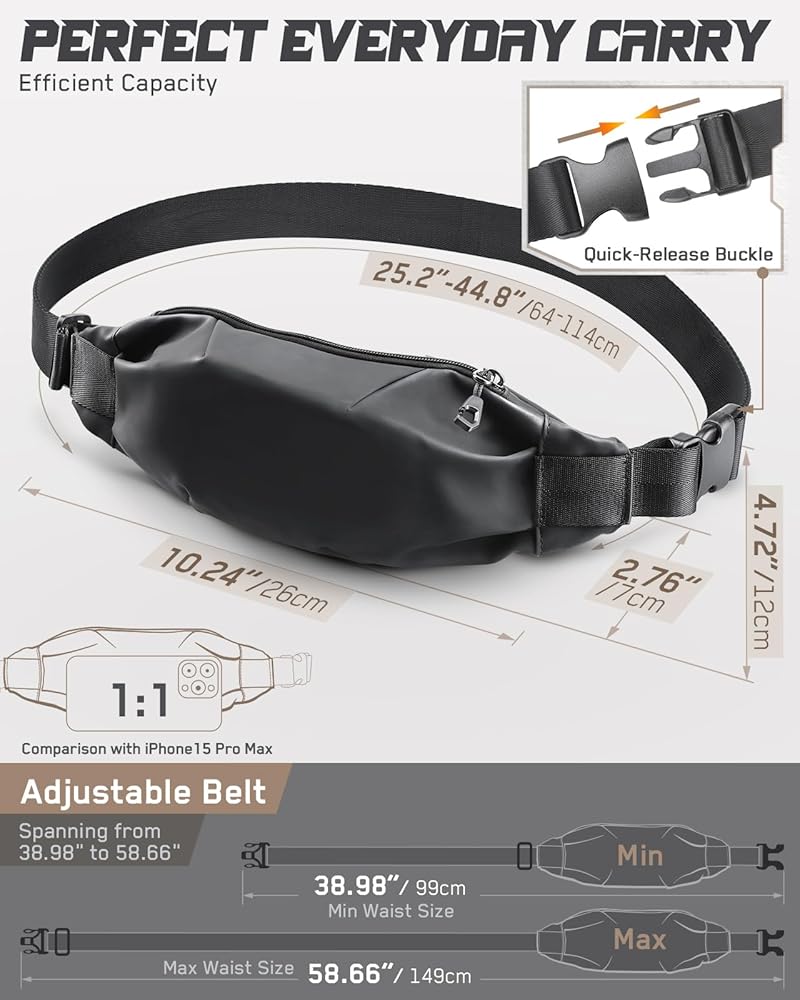 • FLEXIBLE ADJUSTABLE BELT: Men's Fanny Pack tailors your experience with the adjustable waist belt, spanning from 38.98" to 58.66"(including the waist bag), allowing you to customize the waist pack for a secure and comfortable fit. Flexible and sturdy belt socket makes it easy to take on and off, fits various waist sizes including adult, male and female as well as.