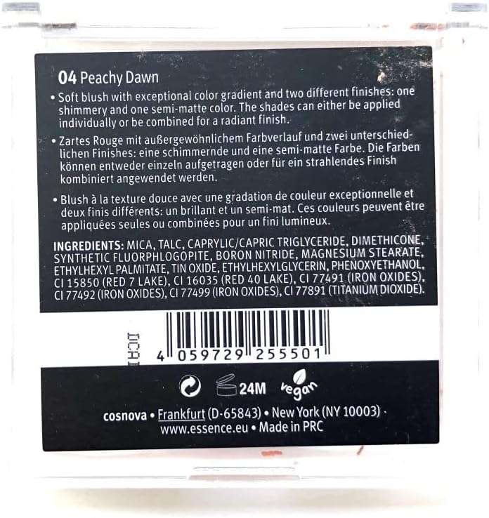 Essence Blush Lighter Gradient Powder Blush, Peachy Dawn, 8g Blush & highlighter in one: can be applied separately or blended for a natural glow. Silky-soft texture. Matte & radiant finish. The blushlighters contain blush and highlighter nuances that merge seamlessly. Whether applied separately, matte to shimmering or together: the shades are sure to create your favourite blush look.