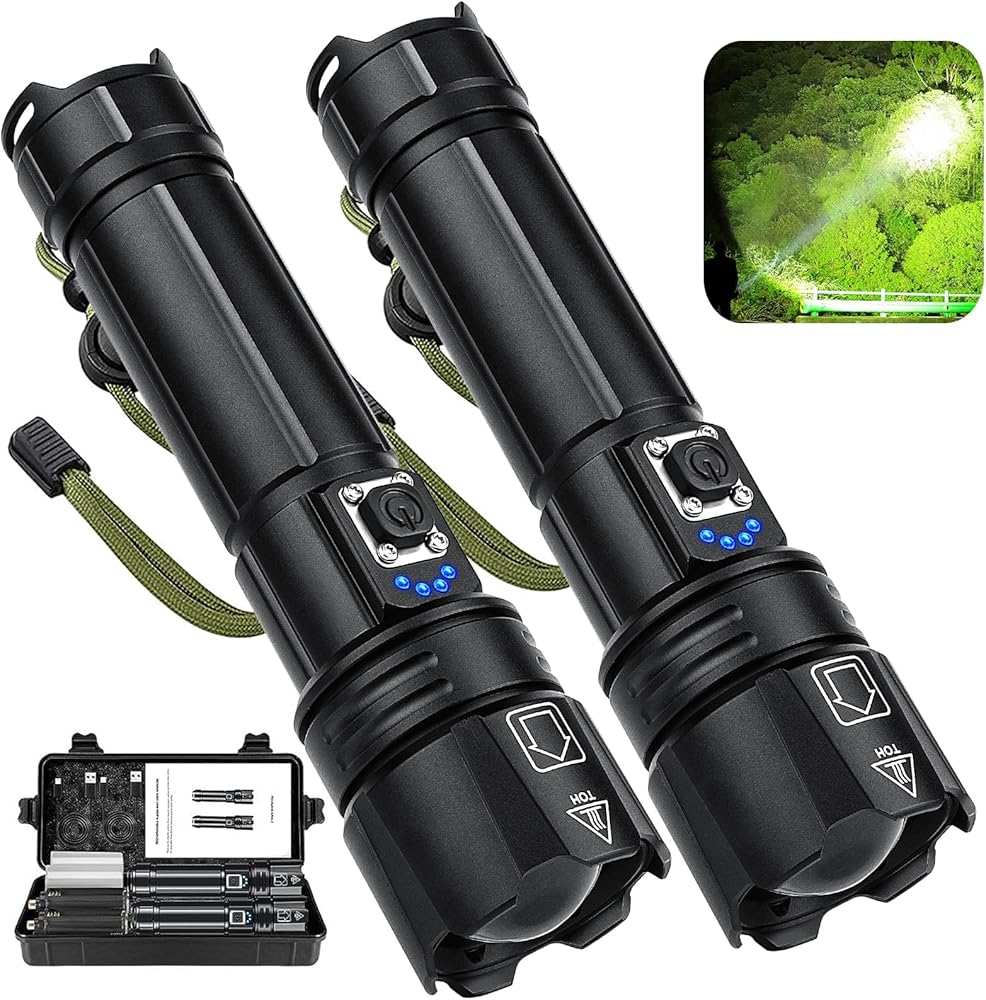 مصابيح LED الأكثر سطوعًا قابلة لإعادة الشحن، 990,000 لومن مصباح يدوي فائق السطوع، مصابيح يدوية عالية الطاقة، ضوء فلاش مقاوم للماء مع حالات للتخييم في حالات الطوارئ (قطعتان)