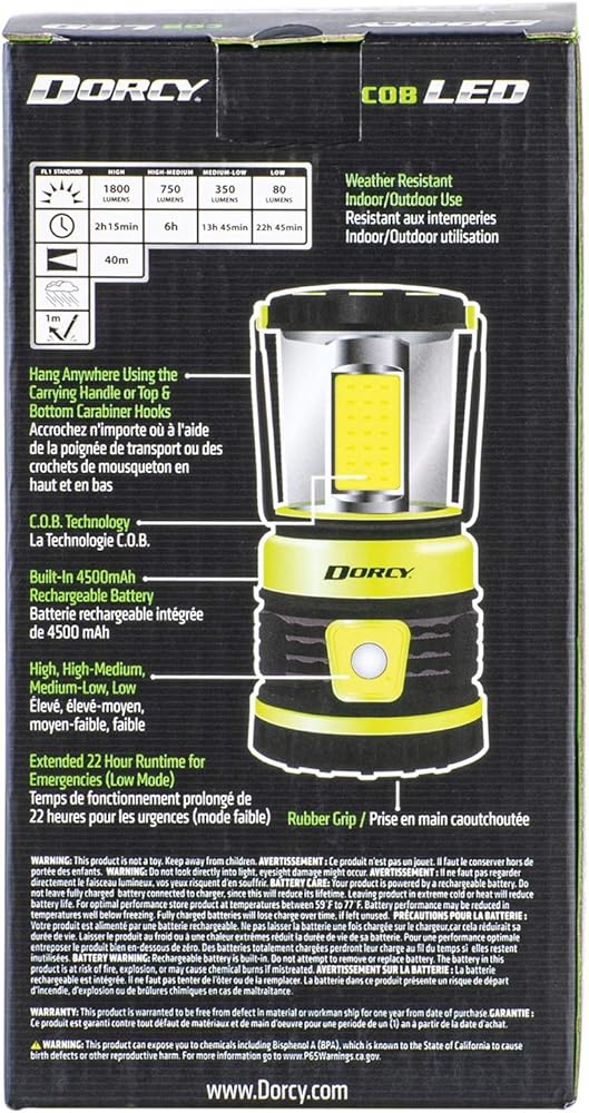 The Dorcy 1,800-Lumen Rechargeable Adventure Lantern features 4 light functions including high, medium high, medium low, and low. With the variety of brightness modes, it allows you to have the right amount of light for any situation along with controlling the run time. With a 4,500 mAh Li-Ion rechargeable battery, this lantern has a 6-hour charge time and has a USB output port to charge devices. The lantern has up to a 22-hour and 45-minute run time while producing 80 lumens. This lantern is also weather-resistant and includes foldaway clips for hands-free use. It is ideal for hiking, camping, and other outdoor adventures as well as power outages and other emergencies.