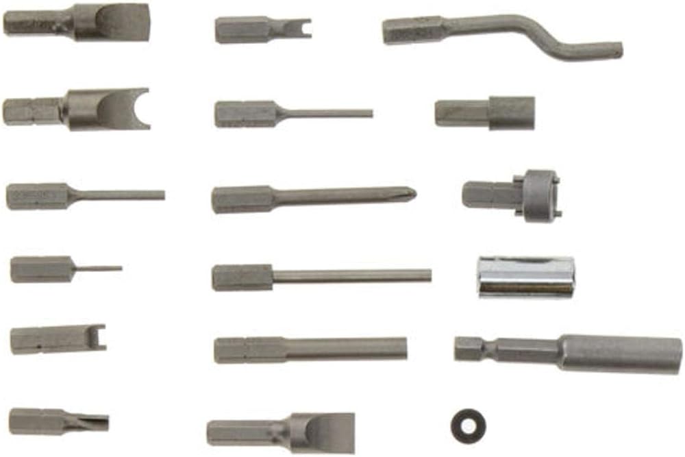 The Wheeler Engineering 17-Piece Screwdriver Upgrade Set contains 15 specialty bits, a shaft extension and a square to hex adapter. Upgrade your Wheeler Screwdriver Set with these bits. Includes 15 specialty gunsmithing bits: Weaver/Ruger scope ring clamp bit, Redfield windage screw bit, Leupold windage screw bit, Ruger/Colt SA base pin latch nut bit, 1911 grip screw bushing driver, M1/M14/MIA rear sight bit, Millett rear sight adjustment bit, Mauser stock bolt bit, .062" pin punch, .093" pin punch, .118" pin punch, Glock replacement front sight screw bit, S&W rebound spring compressor tool, Remington M870/1100/1187 trigger plate pin punch, and 2" #2 Phillips.