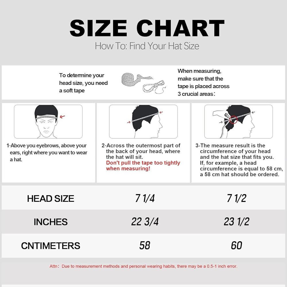 • يتوفر مقاسان: 58 سم (الملاءمة الأفضل لحجم الرأس 7 1/8 - 7 1/4)، 60 سم (الملاءمة الأفضل لحجم الرأس 7 3/8 - 7 1/2)؛ يبلغ عرض الحافة حوالي 2.75 سم
