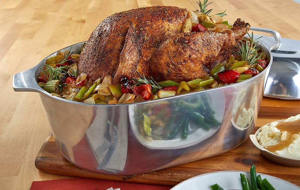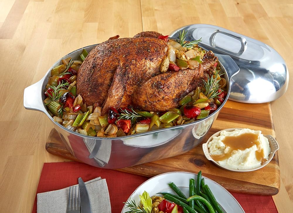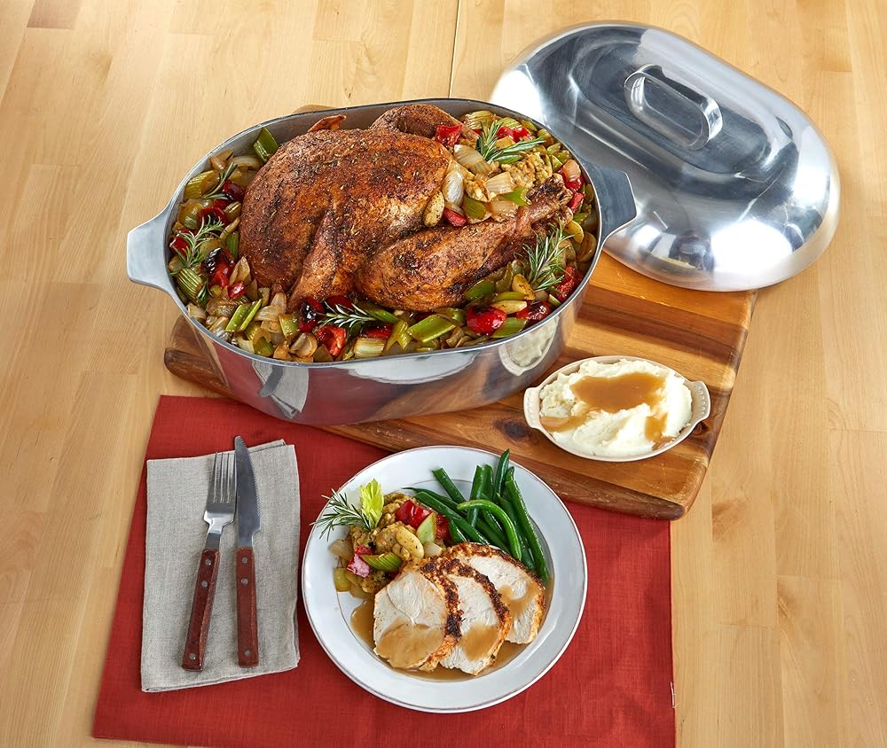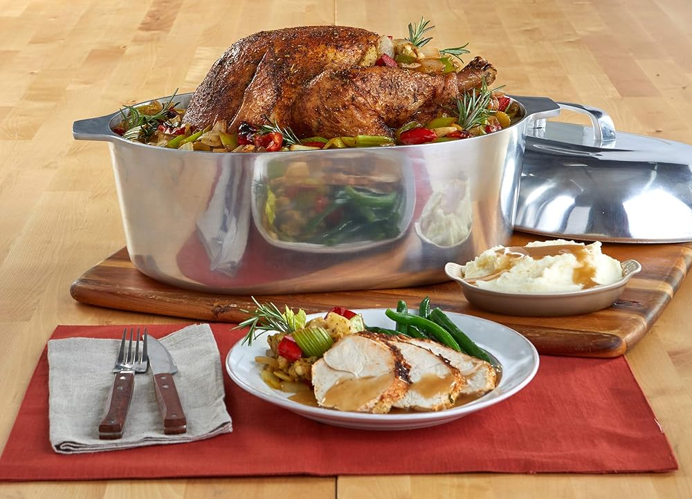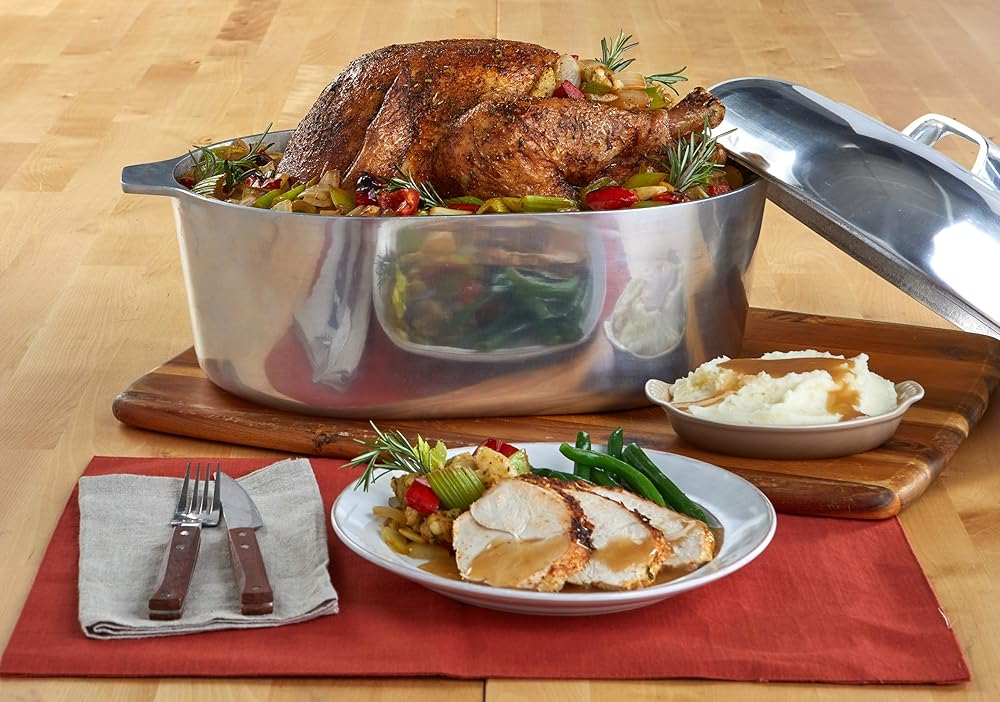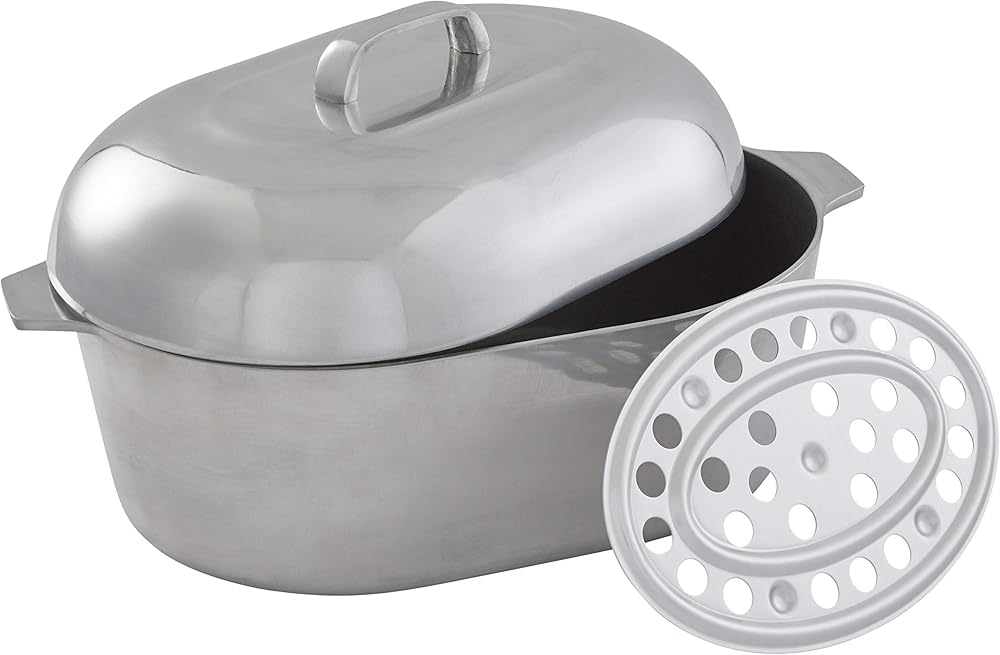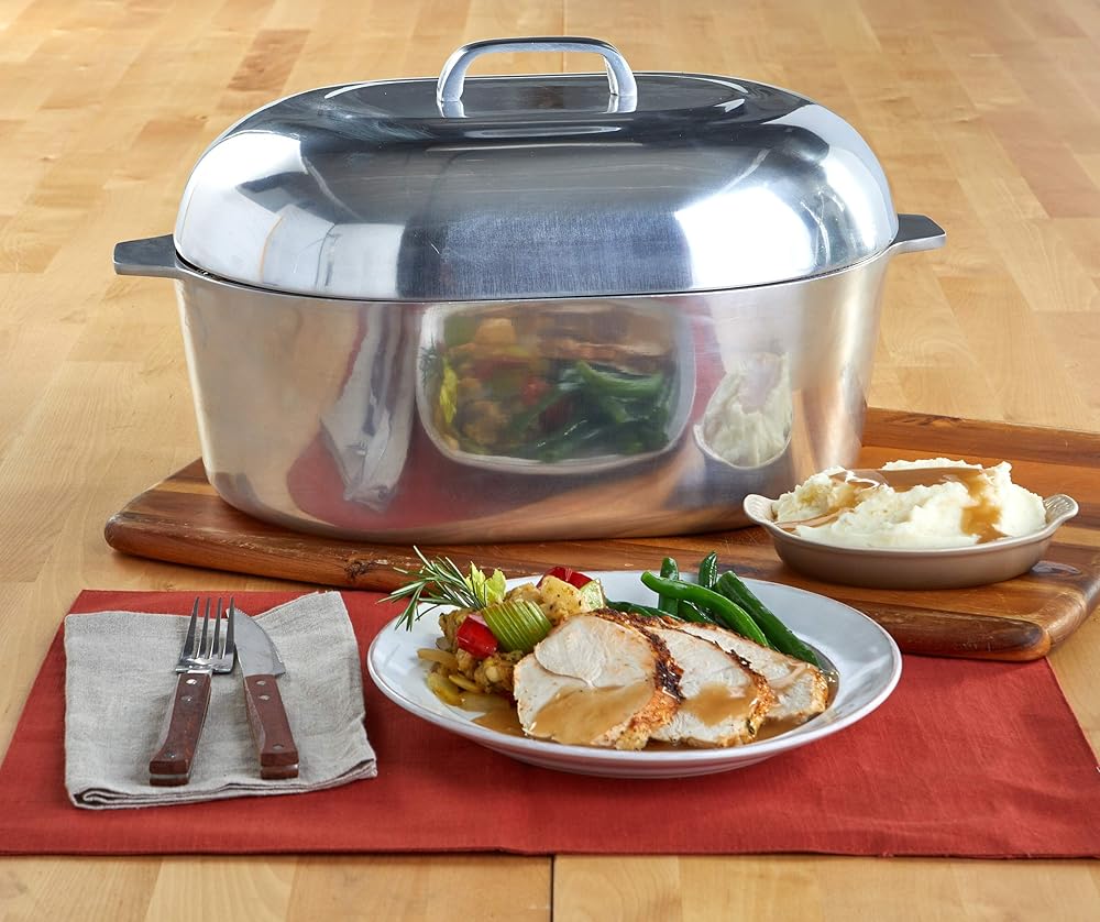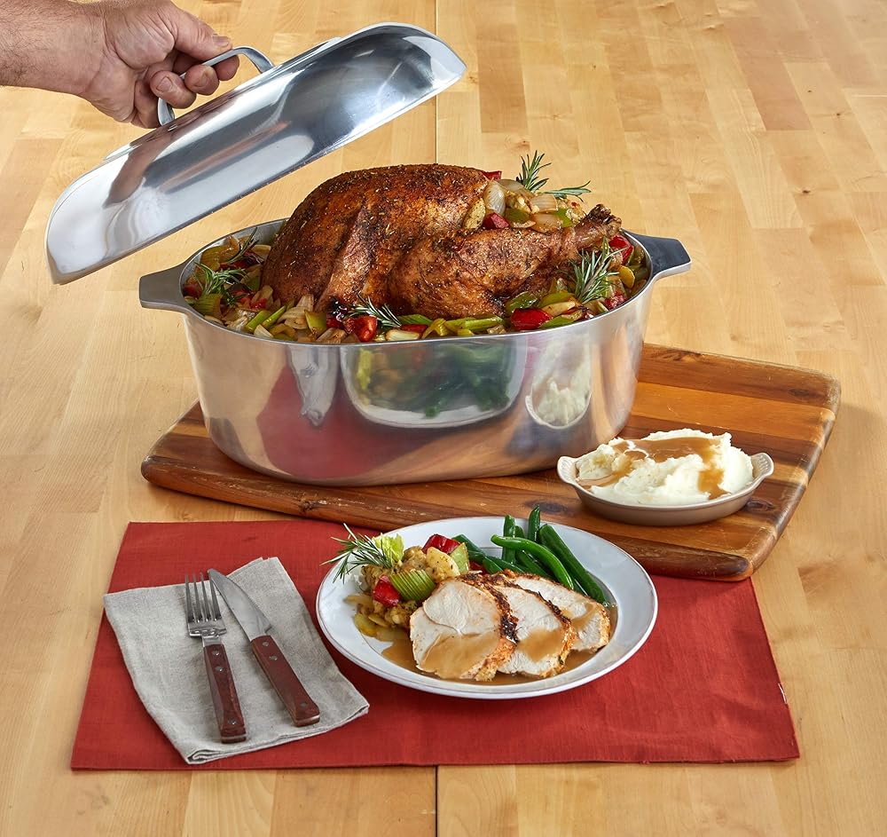 Natural Interior Finish.Mirror Polished Exterior.Aluminum Side Handles & Knob for Easy Transport.Ideal for Roasting, Steaming and More