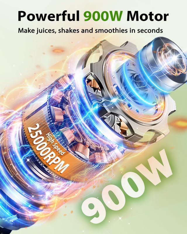 • محرك قوي 900 واط، سحق الأطعمة في ثوانٍ - خلاط عصير بقوة 900 واط مع محرك توربو نحاسي مطور، سرعة عالية 25000 دورة في الدقيقة، أسرع وأقوى. يمكن لخلاط الطاقة المدمج هذا أن يحول أي شيء إلى مواد مغذية ناعمة وقابلة للشرب في 30 ثانية.