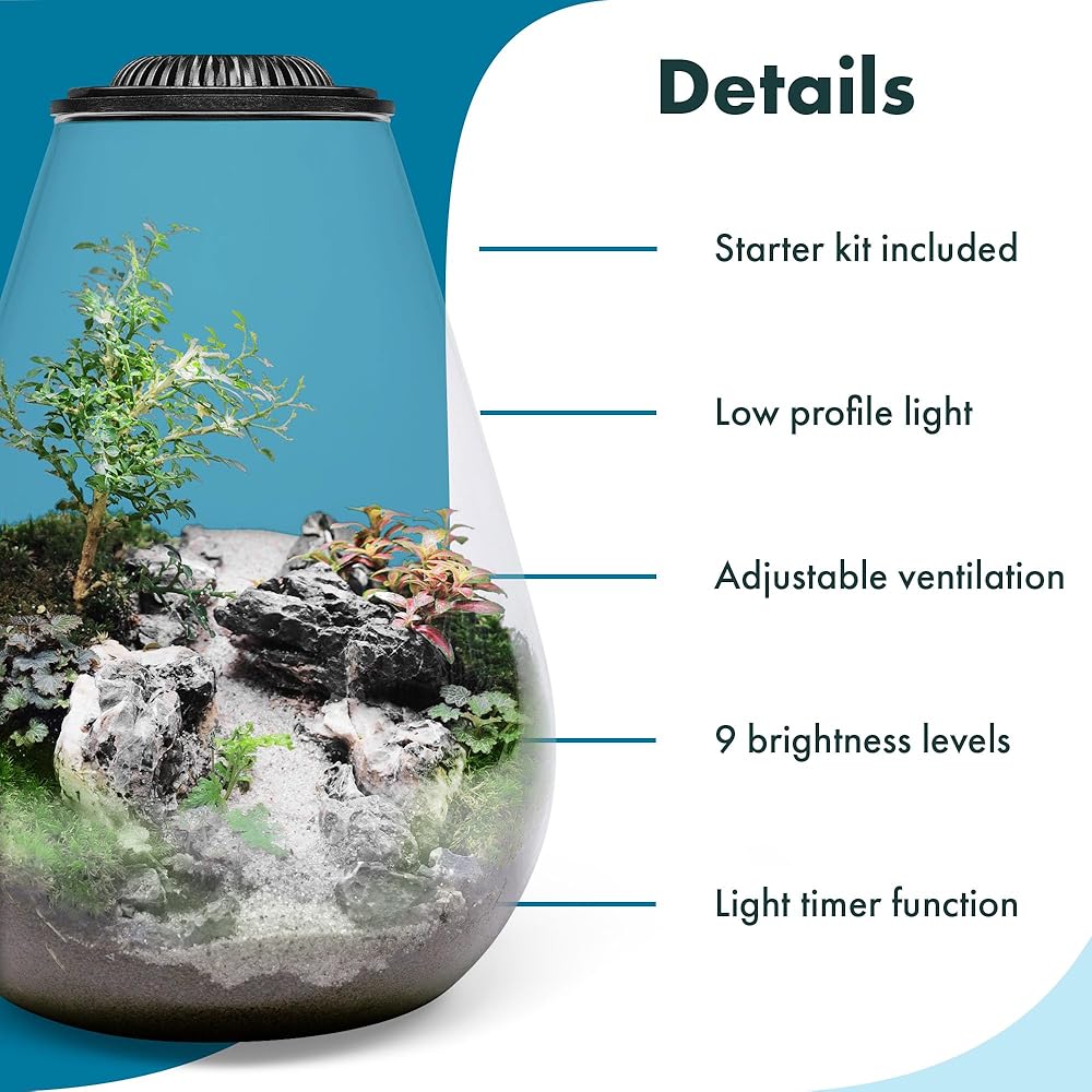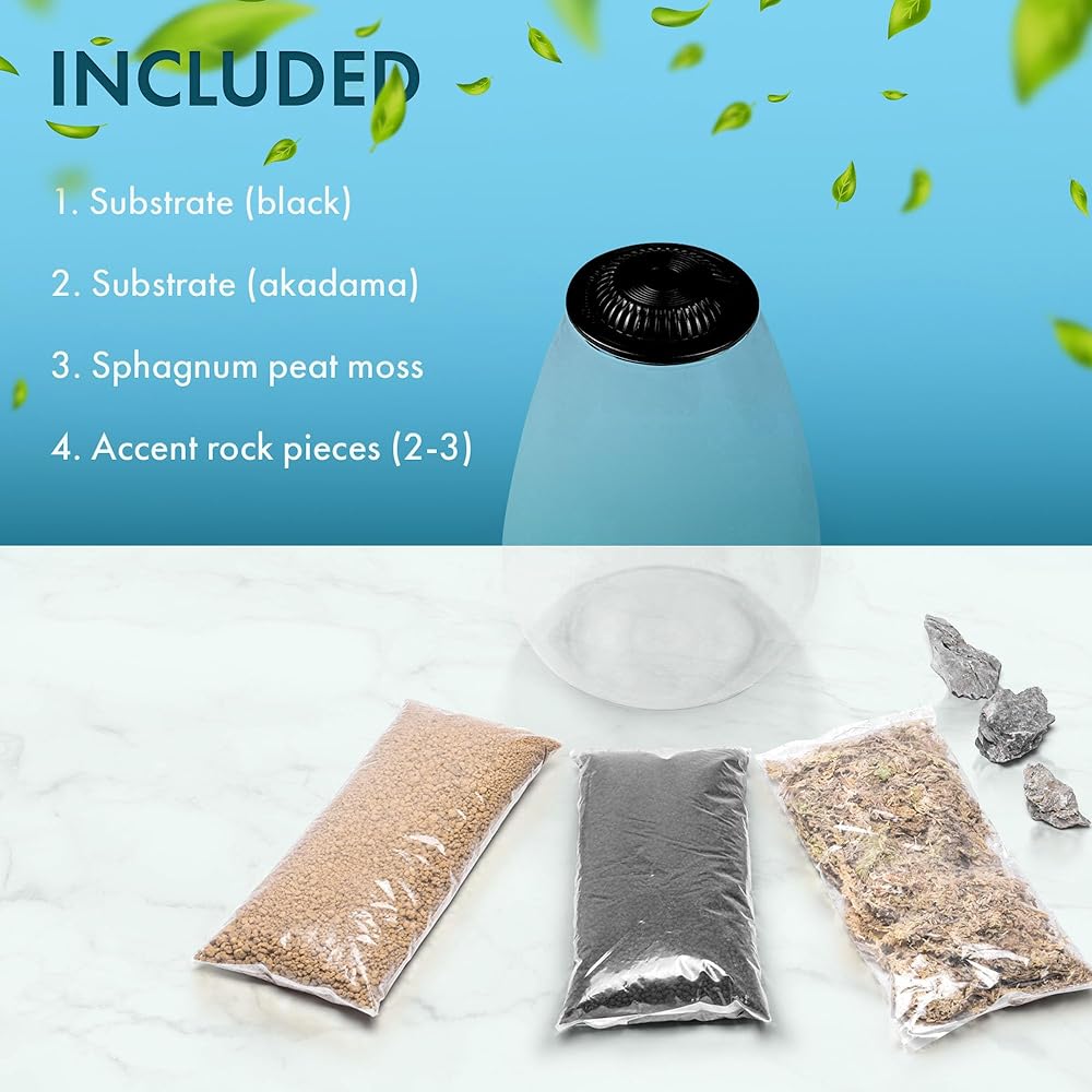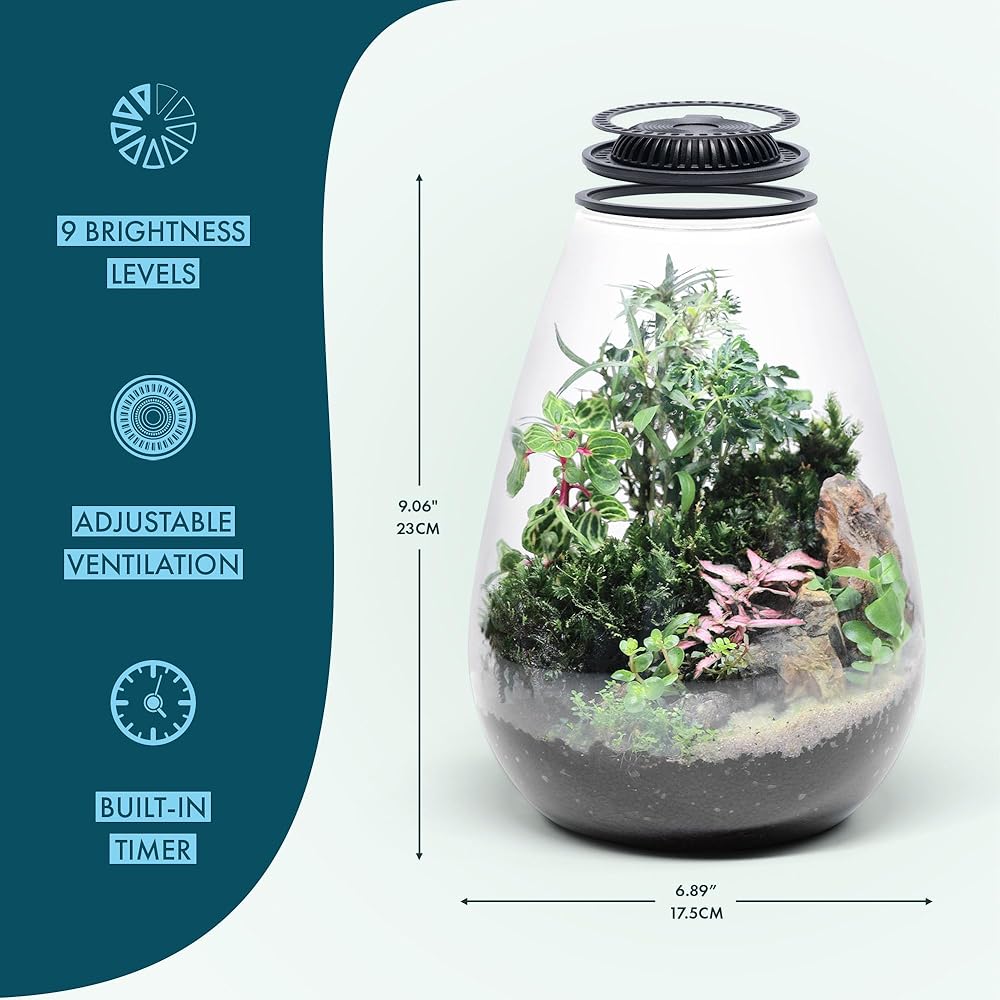 Introducing the SubstrateSource Bio Bowl and Bio Cylinder, ideal for terrarium enthusiasts seeking a compact solution without compromising on aesthetics. Tailored for enclosed terrarium glass use, this versatile product can also serve as a filterless aquarium jar, offering flexibility for various setups. Whether adorning your desk, bookshelf, or counter, this complete plant terrarium with light brings nature's charm to any space. Experience the convenience of this terrarium jar with lid's low-profile and full-spectrum terrarium light, adjustable ventilation, and a light timer function, allowing you to customize the environment for your plants' needs. With a simple rotation of the inner ring, you can manage humidity and airflow easily. Equipped with 9 adjustable brightness levels, this terrarium for plants allows you to control the lighting for optimal growth. Crafted from durable glass, it offers a clear view of its contents, allowing you to admire your enclosed ecosystem with clarity and precision while providing long-lasting durability and strength. Explore three distinct terrarium glass containers with our Bio Terrarium series: the 200 and 150 Bio terrarium cylinder selections or the charming 200 Bio Bowl in an egg shape. Each starter kit arrives complete with all the essentials, offering a seamless setup process. Enjoy the simplicity and convenience of cultivating a beautiful and thriving indoor garden with an innovative terrarium solution from SubstrateSource.