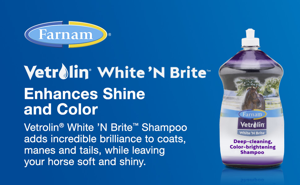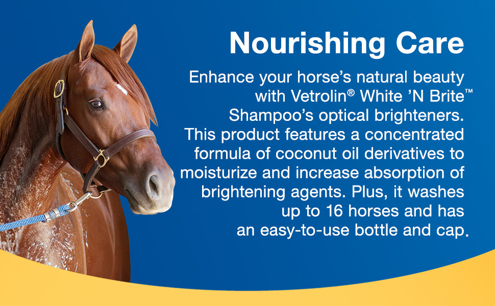 CARE FOR YOUR HORSE with quality grooming. Vetrolin White 'N Brite shampoo brightens light-colored coats and enhances highlights on dark-colored coats.