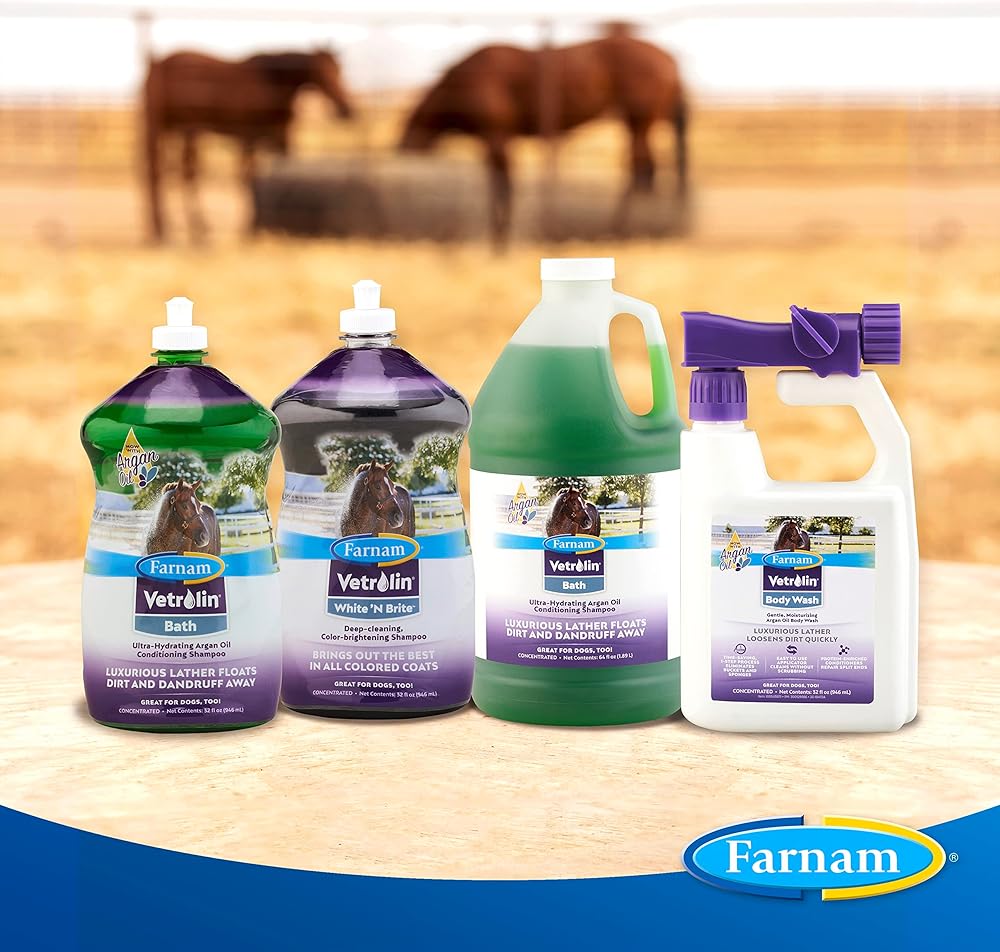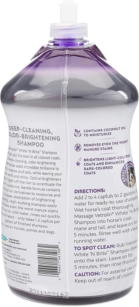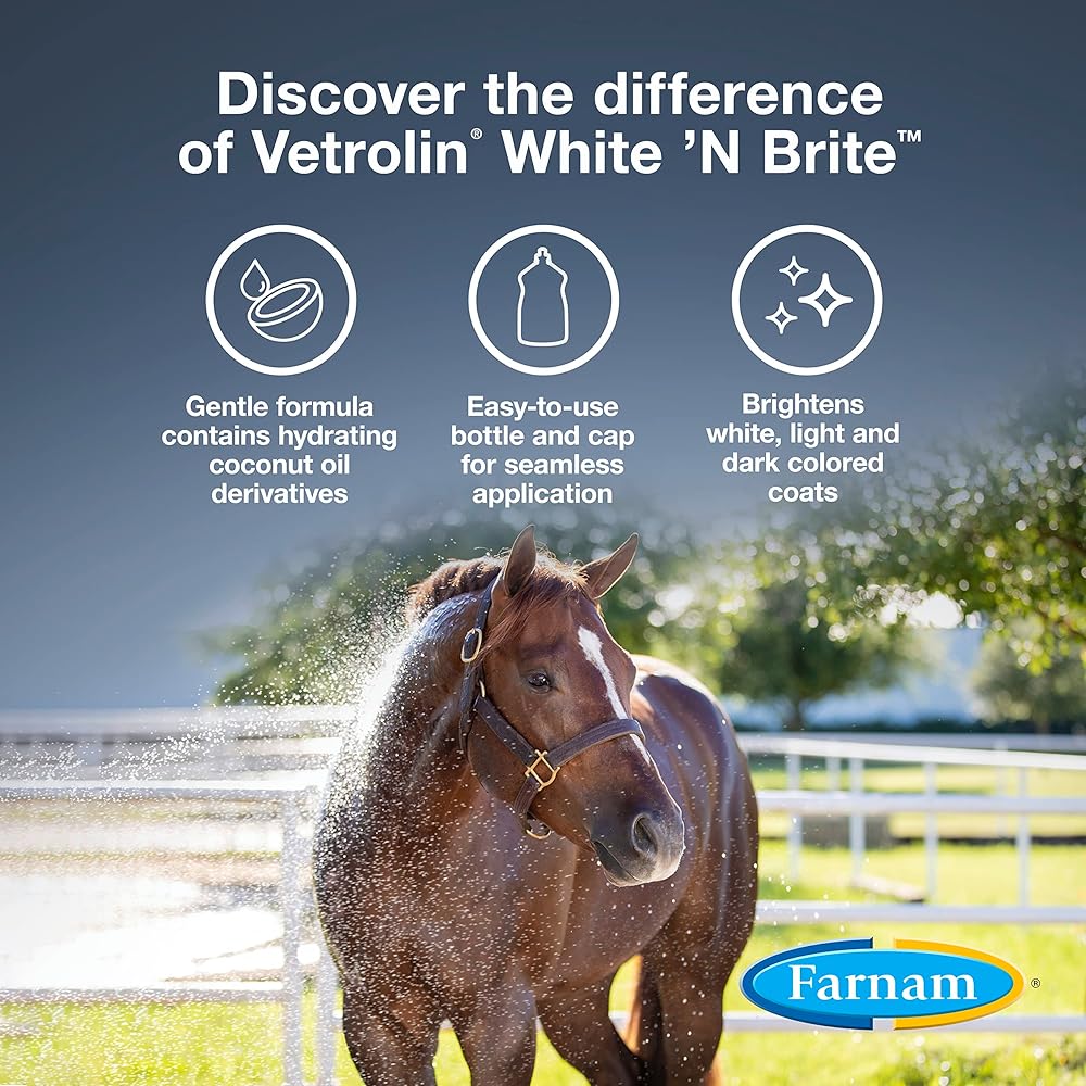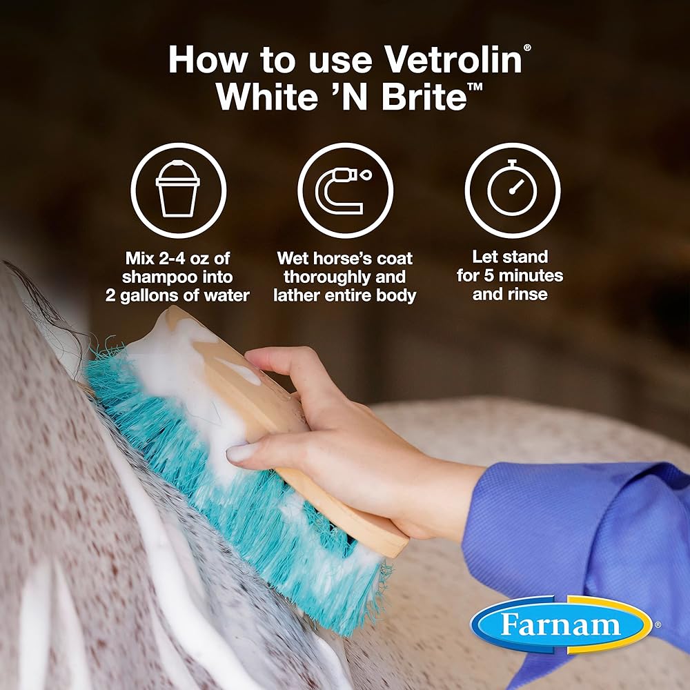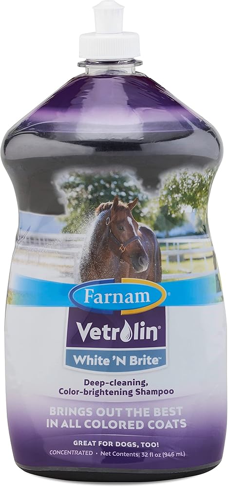 Vetrolin White 'N Brite Shampoo brings out the best in all colored coats. Deep-cleaning, color-brightening shampoo adds incredible brilliance to coats, manes and tails, while leaving your horse soft and shiny. Optical brighteners reflect light off the hair to accentuate the coat's radiance. Gentle formula contains coconut oil derivatives to moisturize and increase absorption of brightening agents. This high-sudsing shampoo works with hot or cold water and rinses out quickly. Concentrated formula which only takes 1-2 ounces per gallon of finished shampoo. A great spot remover, Vetrolin White 'N Brite Shampoo, easily removes even the worst yellow manure stains. When mixed with water, this formula washes up to 16 horses and is great for dogs too! The bottle features a curved design, easier to hold in wet environments and a pop-up cap that is easy to open. Widely recognized as the leader in quality horse care products, Farnam offers an ever-expanding range of equine essentials and has been your partner in horse care for over 75 years.
