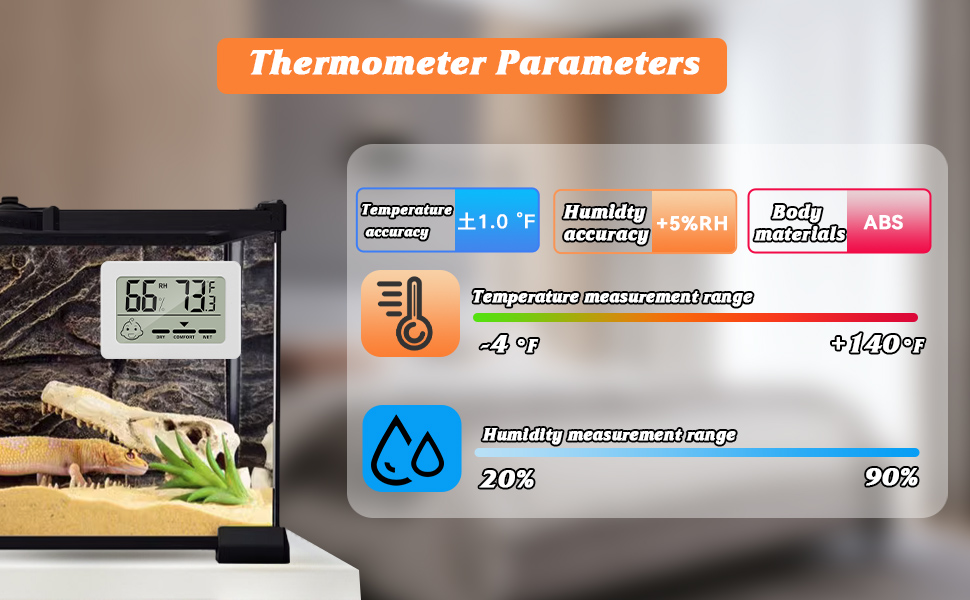 【مقياس حرارة/مقياس رطوبة للزواحف عالي الدقة】يستخدم مقياس حرارة الرطوبة الرقمي المحمول من Thlevel مستشعرًا متقدمًا لدرجة الحرارة والرطوبة مع شريحة قياس مدمجة عالية الدقة، والتي يمكنها قياس نطاق درجة الحرارة بدقة من -4 درجة فهرنهايت إلى 140 درجة فهرنهايت و20 درجة. %RH -90% نطاق الرطوبة النسبية.