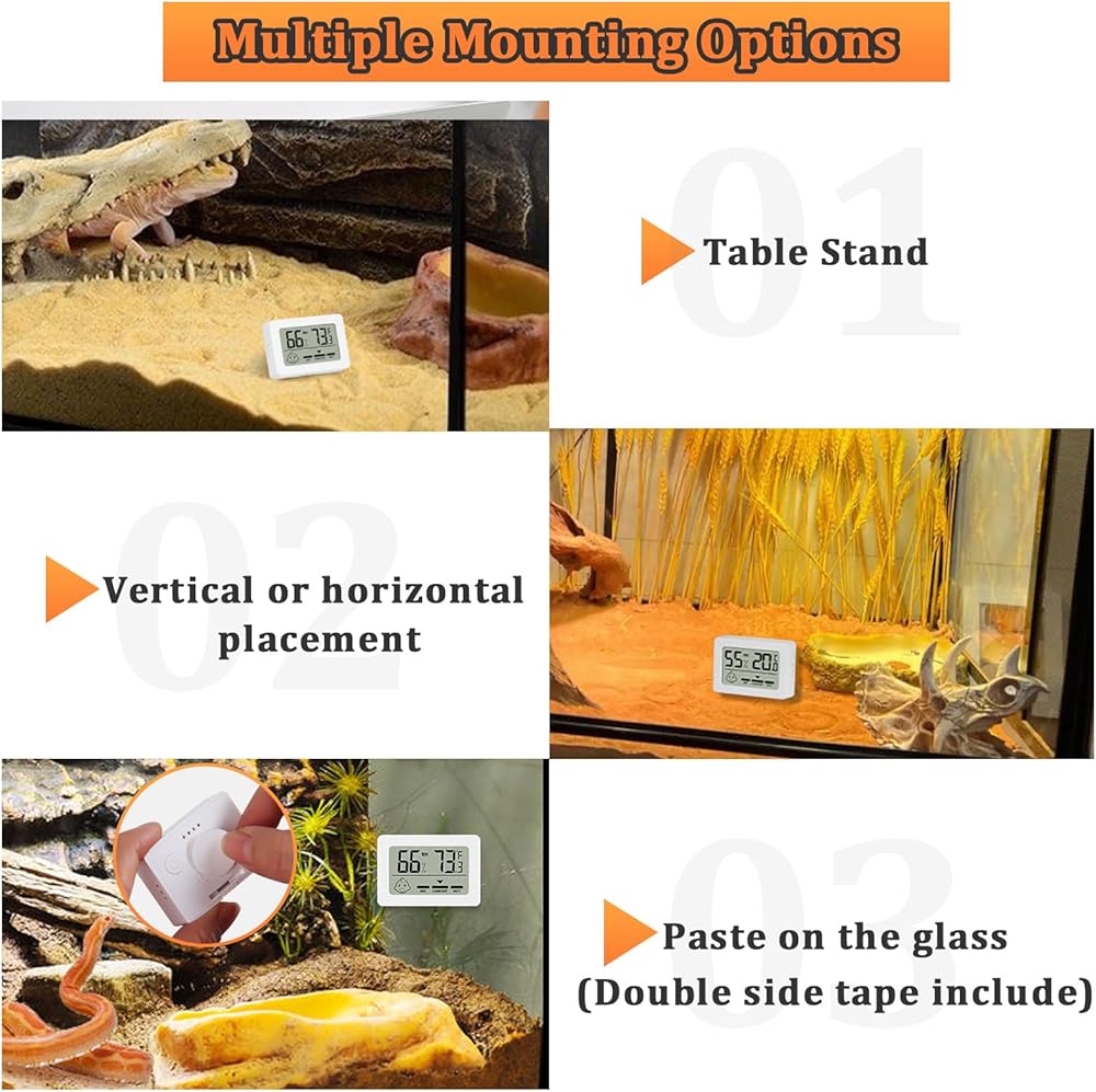 【سهل التركيب】تصميم صغير، يمكن وضع مقياس حرارة الرطوبة الرقمي للزواحف في أي مكان. يمكنك وضع مقياس الرطوبة الحراري مباشرة في الخزان عموديًا وأفقيًا، أو إمالته في خزان الزواحف من خلال الدعامة، أو لصقه في الثلاجة، والجدار، خزان الزواحف من خلال الشريط على الوجهين.
