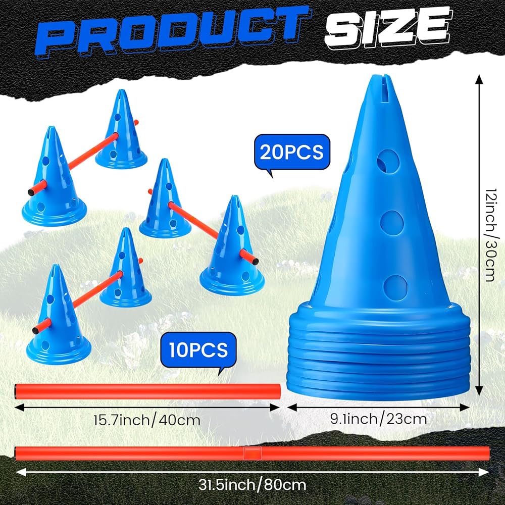 Sufficient Quantity: this dog agility hurdle cone set includes 20 pieces of agility cones and 10 pieces of agility rods, providing you with an ample quantity of training equipment; With this set, you can create a challenging and engaging obstacle course for your furry friend, ensuring effective agility training sessions
