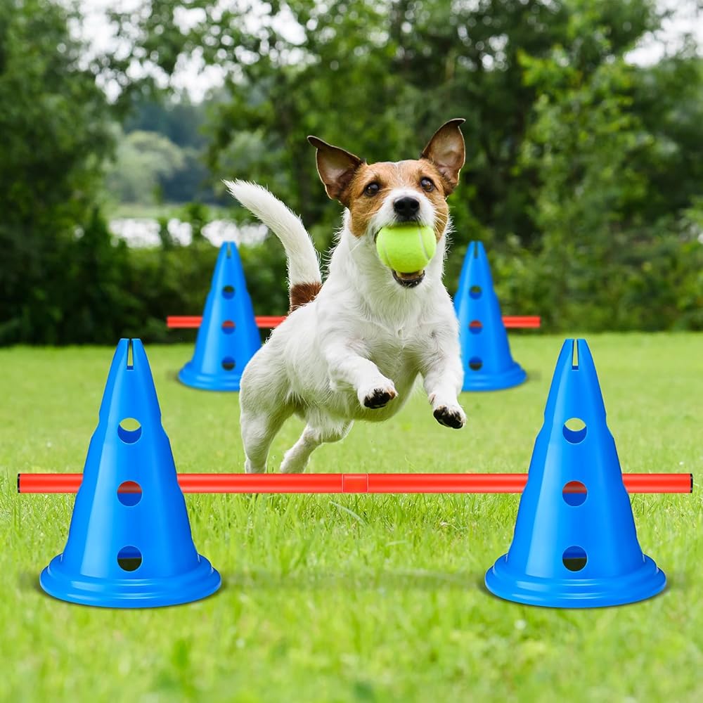 The cones and rods can be applied to create various agility exercises, allowing you to design a nice training routine that targets different skills and challenges your dog's agility.