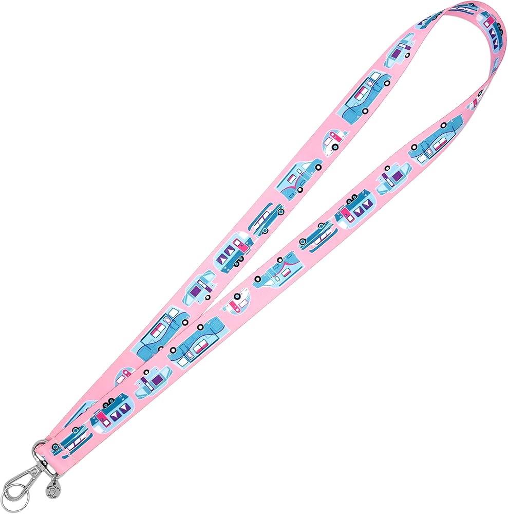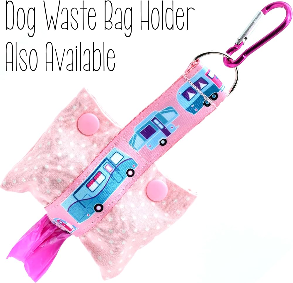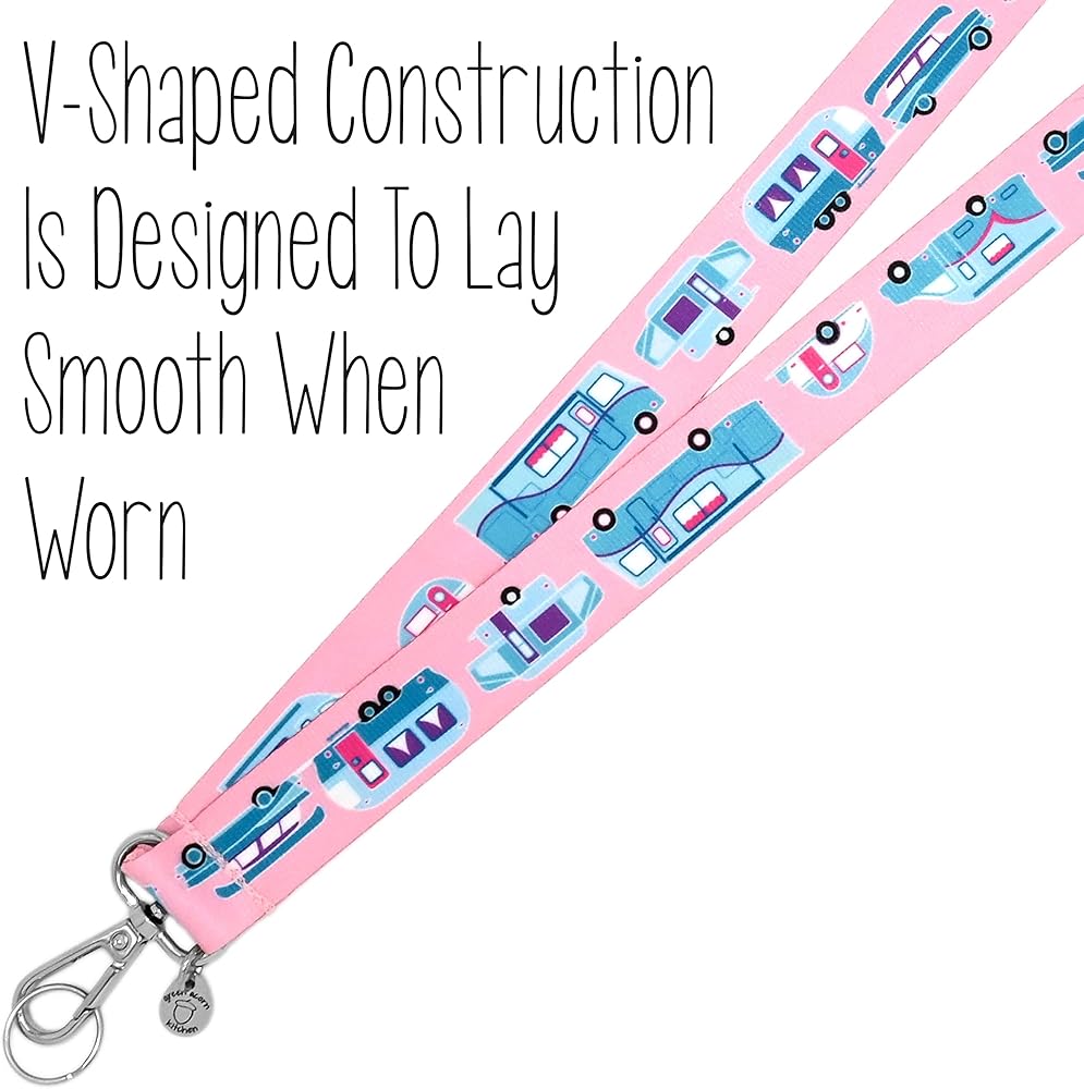 An exclusive design from Green Acorn Kitchen. Double sided lanyard is decorated with a vintage trailer and car, class B or class C camper, teardrop trailer, motorhome and pop-up tent trailer. This 1 inch wide polyester lanyard ribbon is a rich green with colorful trailers. A metal swivel clip and small key ring complete the construction. Lanyard is durable, attractive and 100% handmade in Minnesota.
