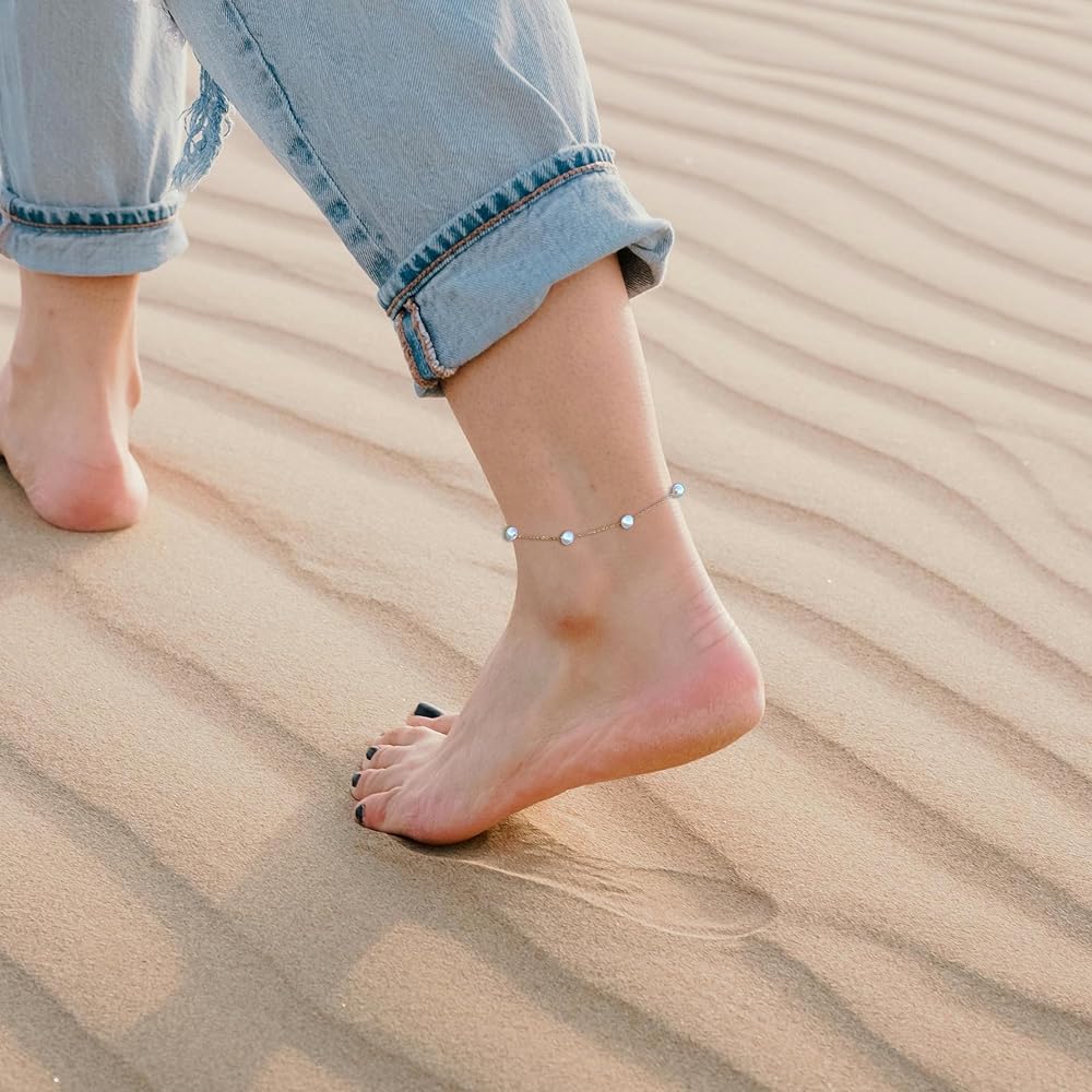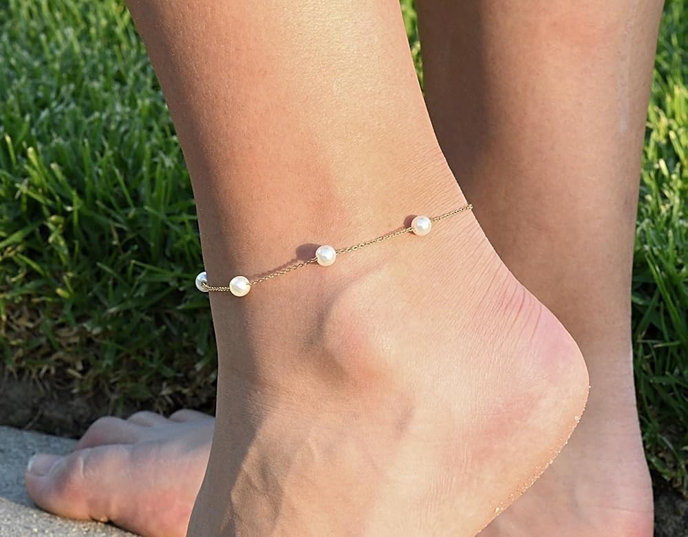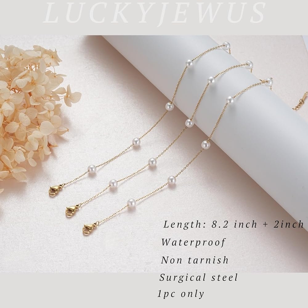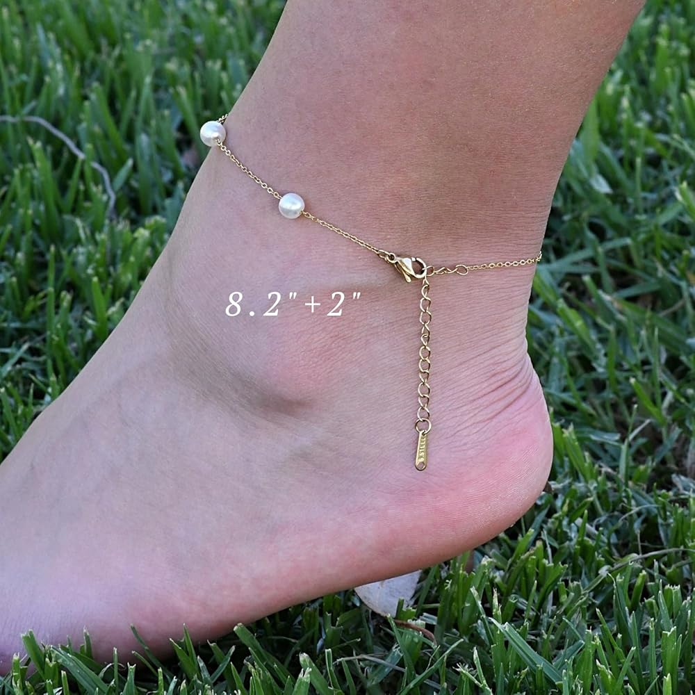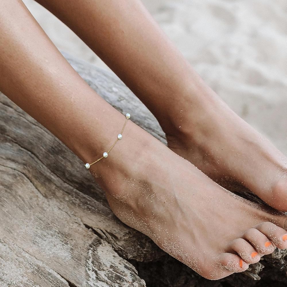أساور الكاحل من اللؤلؤ المطلي بالذهب عيار 14 قيراط للنساء، خلخال أنيق مقاوم للماء