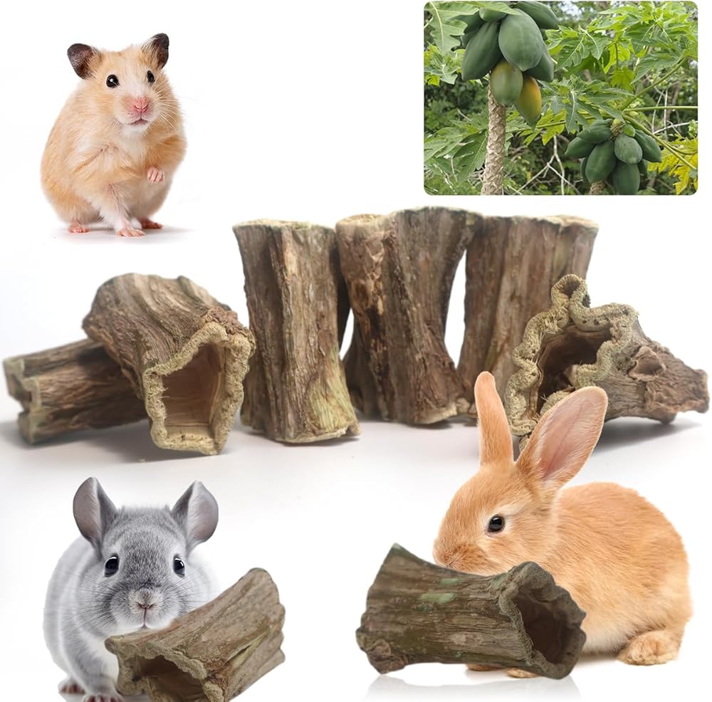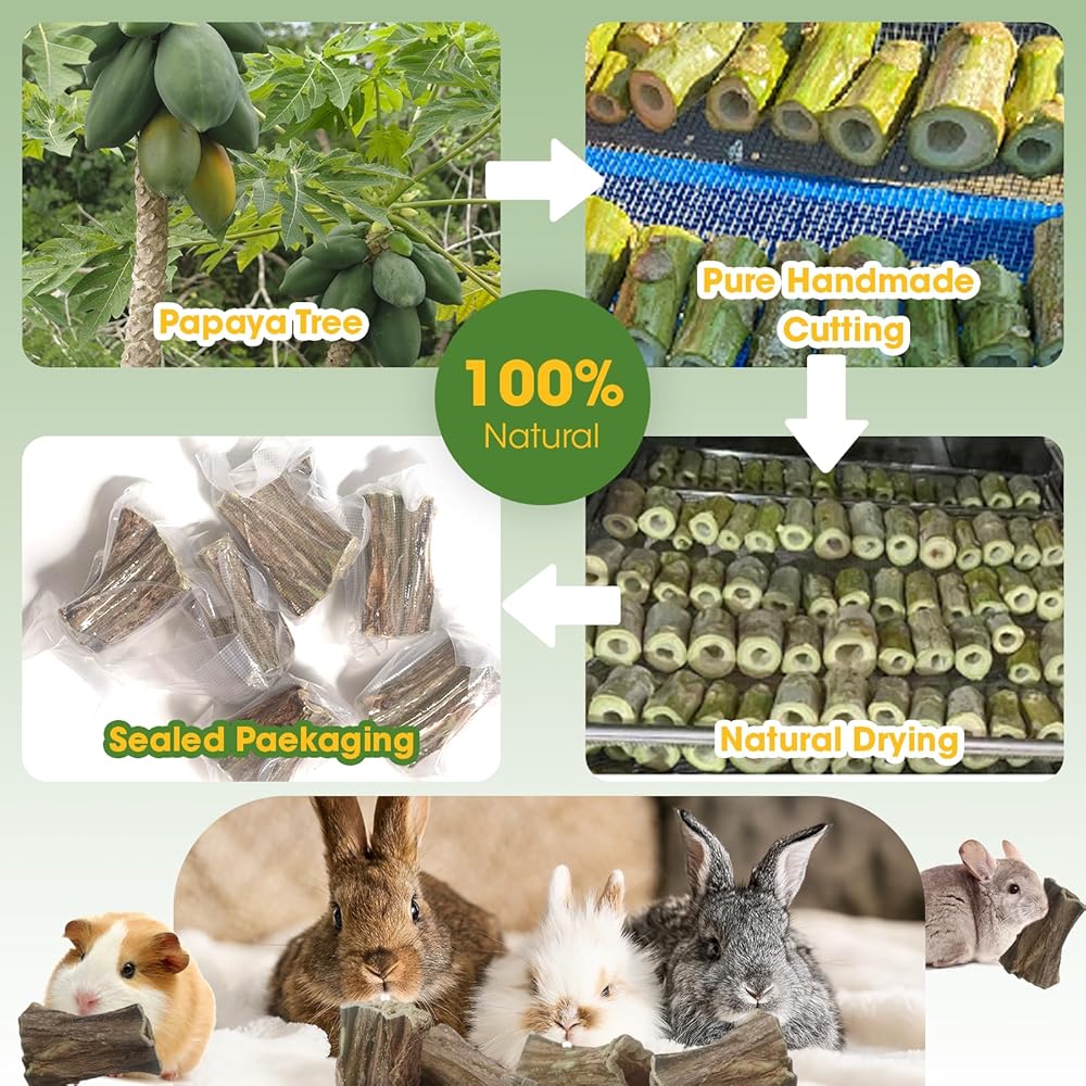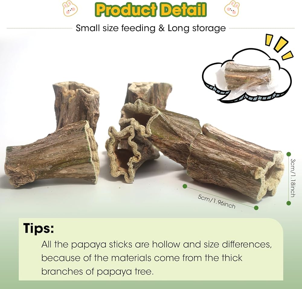 هدية مثالية للحيوانات الصغيرة القوارض: يلتصق خشب البابايا بصلابة معتدلة، طعام رائع وطحن أسنان للحيوانات الأليفة مثل الأرانب والخنازير الغينية والشنشيلا والهامستر والأرانب وما إلى ذلك. رائعة للعب والمضغ، ومتينة، وعملية، ومرنة، ويوصى بها على نطاق واسع. أسنان صحية، استمتع بالترفيه مع حيوانك الأليف القوارض. قل وداعا للملل!