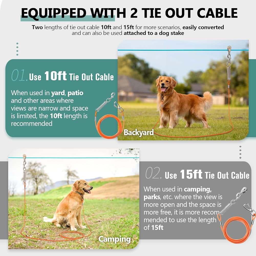 【نظام عربة الكلاب المحسن】حل احتياجات كلبك الخارجية بسهولة! على عكس أنظمة تشغيل الكلاب الجوية الأخرى الموجودة في السوق والتي تأتي فقط مع كابل ربط بطول 10 أقدام، يأتي متسابق الكلاب المتخصص الخاص بنا للفناء بطولين من كابل الربط بطول 10 أقدام و15 قدمًا لمزيد من السيناريوهات، و10 أقدام للحصول على رؤية أضيق للفناء الخلفي و15 قدمًا للتخييم في مناطق أكثر انفتاحا.