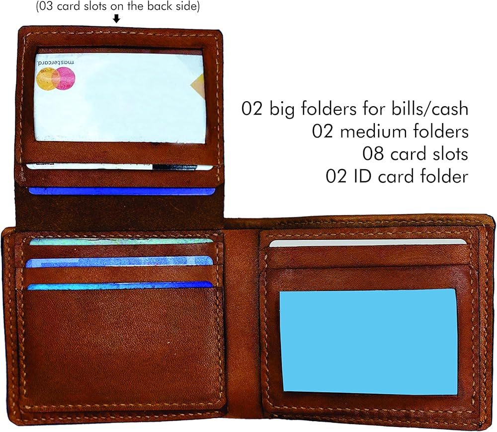 كل ما تحتاجه: تأتي محفظتنا الجلدية المصنوعة يدويًا مع العديد من المجلدات للنقود والفواتير وبطاقة الهوية... إنها مساحة كافية لاستخدامك اليومي.