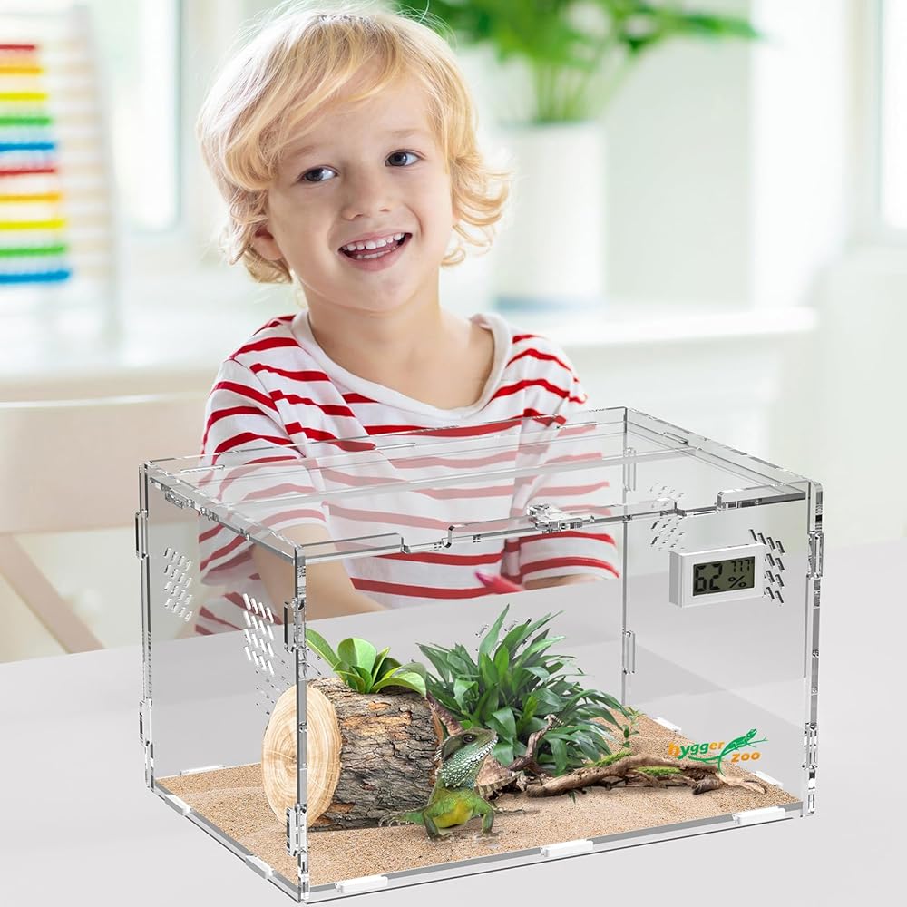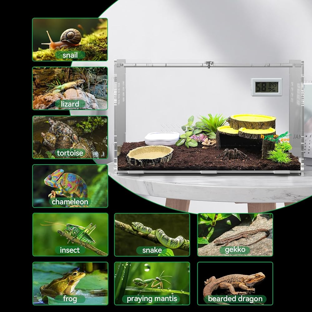 • ديكور منزلي للخزان الأفقي: مصمم بشكل أنيق ليكمل أي ديكور منزلي، خاص لمحبي الزواحف، يوفر غلاف الزواحف الخاص بنا مساحات داخلية واسعة للزواحف الخاصة بك للتجول بحرية. يمكن لمقياس الرطوبة الحراري LCD إظهار درجة الحرارة والرطوبة في الوقت الحقيقي، مما يجعل الزواحف الخاصة بك تعيش أكثر راحة، بينما تضمن الفتحات العلوية والجانبية تدفق الهواء الأمثل. متوفر في 4 أحجام لتناسب احتياجاتك! تررم كبير للزواحف.