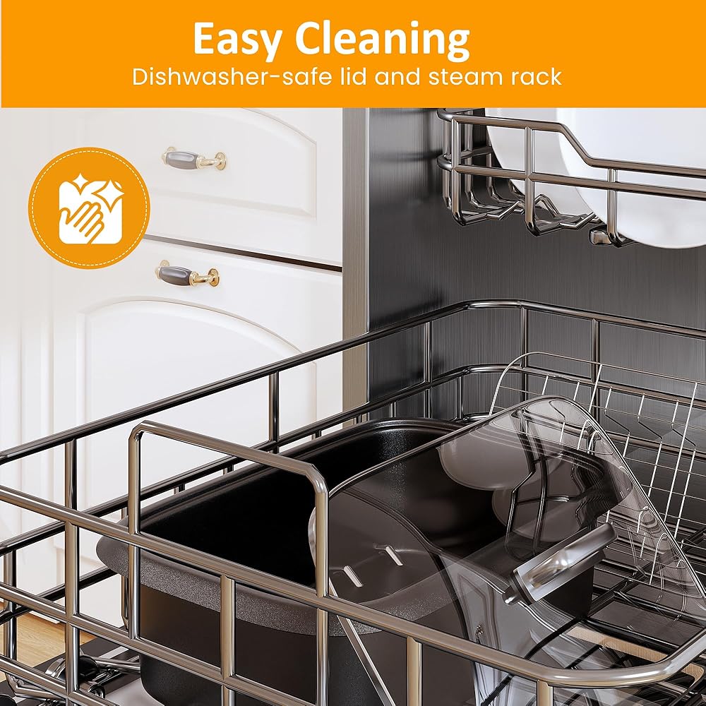 تنظيف سهل: يتميز الطباخ المتعدد بوعاء من الألومنيوم، الذي يتميز بتوصيل الحرارة، مما يضمن تسخينًا متساويًا. علاوة على ذلك، فإن طلائها غير اللاصق يسهل عملية التنظيف بعد كل استخدام عن طريق تقليل التصاق الطعام. رف التبخير (أيضًا للخبز أو الطهي بدرجة حرارة منخفضة بالشفط) والغطاء آمنان للغسل في غسالة الأطباق لسهولة الصيانة.